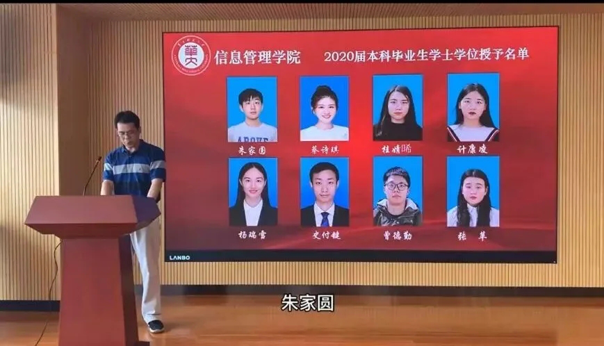 毕业典礼以全体人员起立合唱国歌拉开序幕。接着校党委常委、副校长任友洲进行致辞。他诚挚地向信息管理学院2020届全体毕业生表示祝贺,并从学科建设、创新创业、人才培养以及国际化建设等方面,充分肯定了信息管理学院近年的发展。并引用习近平总书记给北京大学援鄂医疗队全体“90后”党员的回信与毕业生共勉,希望他们在今后的人生中要牢记求知初心,把握时代机遇,其次要坚守行为自觉,践行实事求是,还要砥砺坚韧意志,锤炼过硬本领。精彩致辞后,毕业生们纷纷在留言区回复道,”感谢母校”,“牢记教诲,不忘初心。”