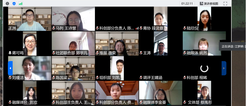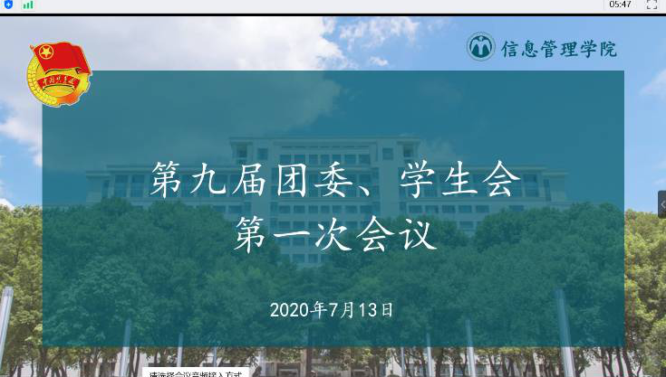 本次会议是团委学生会新任负责人第一次集体会议,通过线上视频会话的方式,增进各部门负责人对兄弟部门工作的了解,加强新任负责人之间的友好联系,推进暑期现阶段各项工作的部署运行,为信息管理学院新一届团学组织内部良好的沟通合作铺垫桥梁。