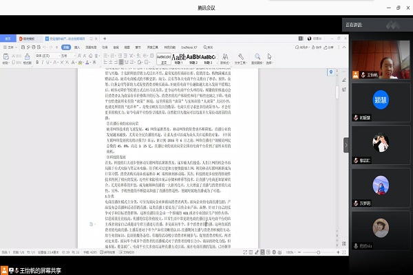 关于调研对象的问题,王怡帆同学发表了自己的观点。她认为直播助农的调研对象应该分为顾客、主播以及农民三类,并指出可以通过发放问卷的方式来获取直播助农的情况。关于可能联系不到主播的情况,她提出可以通过联系客服来获取直播的相关情况。本项目的指导教师冯昌扬老师指出可以从微博评论中寻找调研对象,并通过合适的方式来获取调研问卷。冯昌扬老师的意见为组员们解决问卷无人填写问题提供可能。