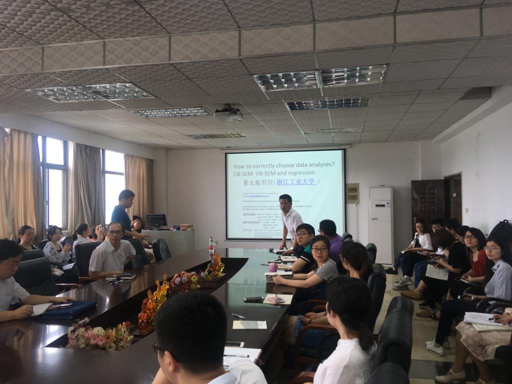 2018年5月24日上午10:00,浙江工业大学教授萧文龙来我院进行了一场题为“How to correctly choose data analyses? CB—SEM, VB—SEM and regression?”的专题讲座。我院众多老师及各级博士、硕士研究生参与了讲座。讲座由副院长曹高辉主持。