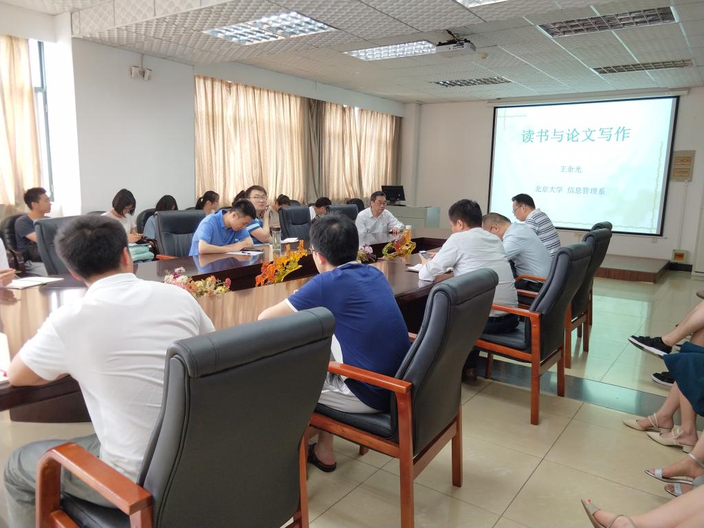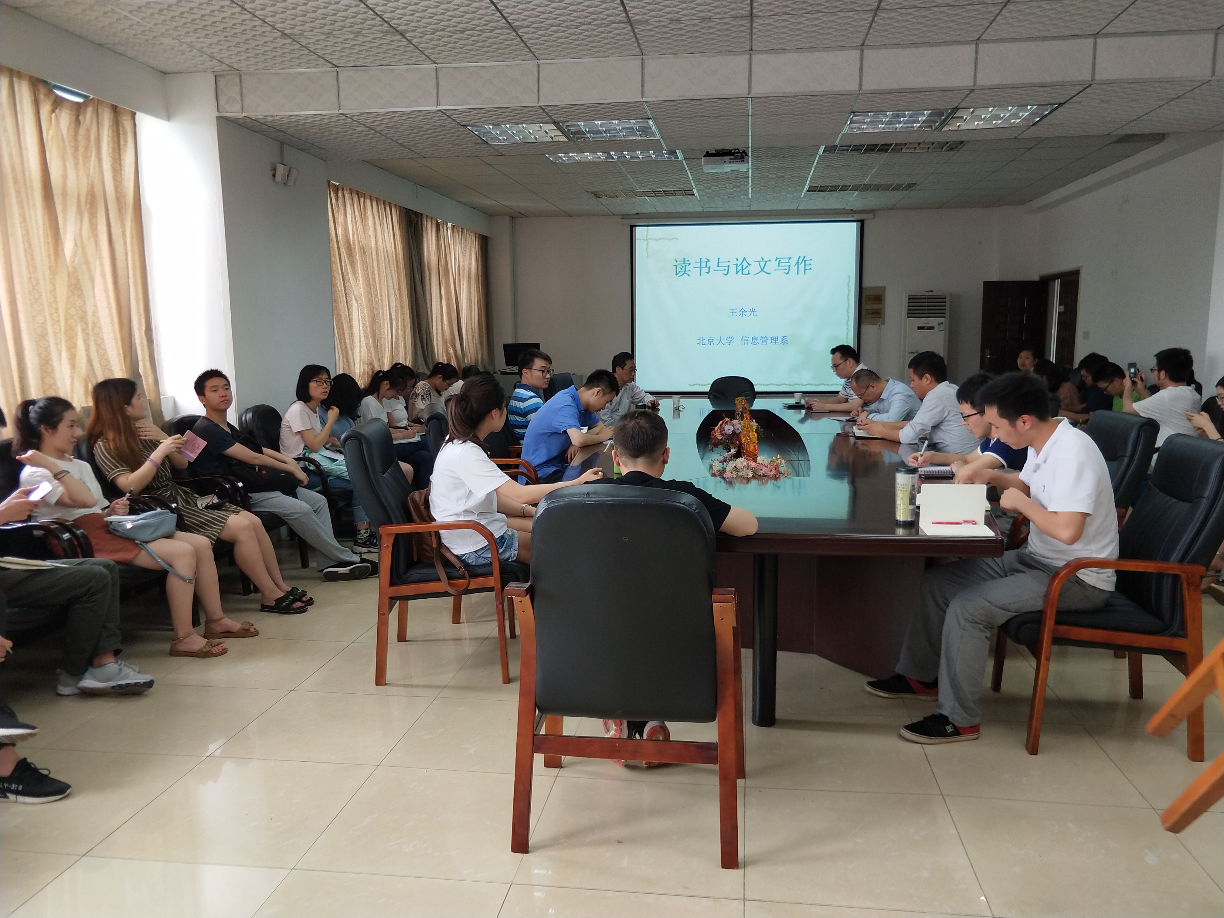 (通讯员 景紫薇)2018年5月25日下午,北京大学信息管理系教授,博士生导师,教育部高等学校图书馆学教学指导委员会主任,中国图书馆学会副理事长,全国古籍保护工作专家委员会委员王余光先生,在我院918会议室进行了题为“读书与论文写作”的演讲与学术交流,其中,易明老师负责主持,众多师生参与了此次讲座。