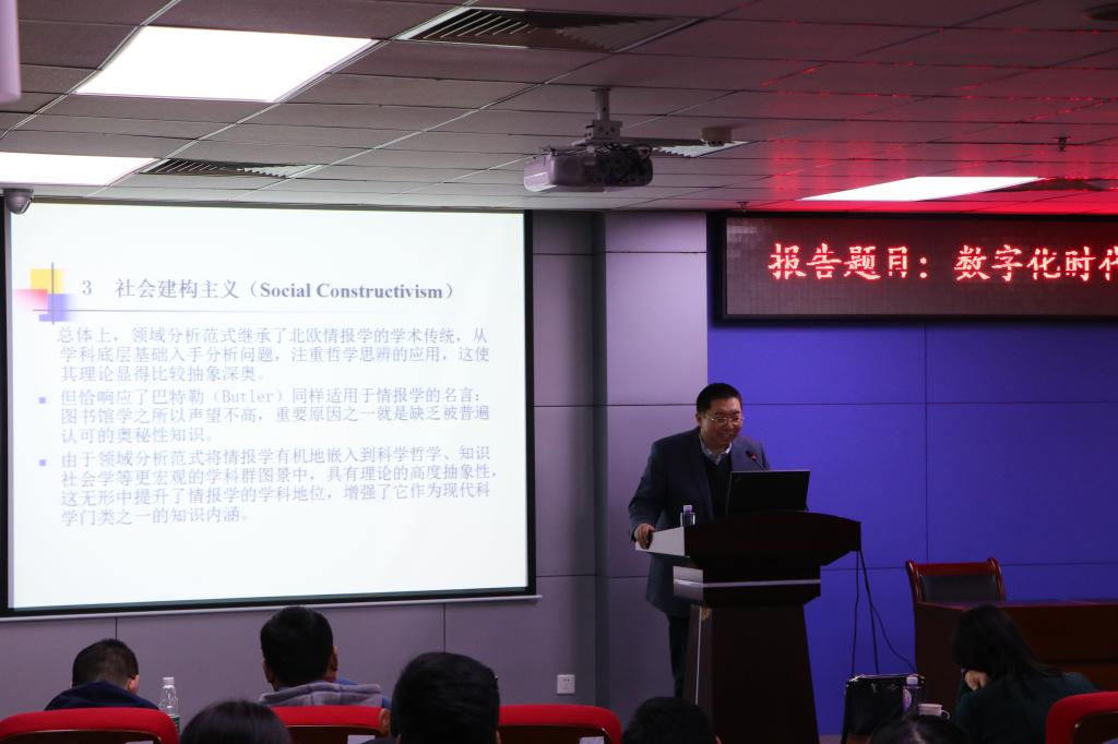 (通讯员 卢瑞娜)12月6日下午,我院有幸邀请天津师范大学管理学院王琳教授莅临我校图书馆三楼学术报告厅,展开一场以“数字化时代情报学基础理论研究新探”为题的讲座报告。本次讲座由曹高辉副院长主持,各届学生积极参与。