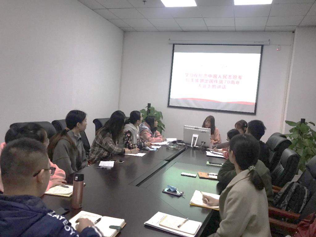 会议伊始,全体党员在武晓红同志的带领下深入学习了习近平总书记在纪念中国人民志愿军抗美援朝出国作战70周年大会上的讲话精神。大家纷纷表示通过学习,认识到了中国人民志愿军抗美援朝战争的重大意义:抗美援朝战争伟大胜利,是中国人民站起来后屹立于世界东方的宣言书,是中华民族走向伟大复兴的重要里程碑,对中国和世界都有着重大而深远的意义。学习过后,与会同志畅所欲言,积极交流自己的心得体会。刚刚吸收为预备党员、第一次参加党日活动的田恬同志表示:“中国人民伟大的“抗美援朝,保家卫国”战争,是中国人民不畏强暴,反抗侵略的伟大壮举,是中华民族的光荣与骄傲。我们要深切缅怀在抗美援朝战争中牺牲的志愿军烈士们,永远铭记他们的丰功伟绩,激励我们发扬光荣的革命传统,为建设繁荣富强的伟大祖国而努力奋斗。”田聪娇同志也说到:“习近平总书记在讲话中提出:“无论时代如何发展,我们都要砥砺不畏强暴、反抗强权的民族风骨;无论时代如何发展,我们都要汇聚万众一心、勠力同心的民族力量;无论时代如何发展,我们都要锻造舍生忘死、向死而生的民族血性;无论时代如何发展,我们都要激发守正创新、奋勇向前的民族智慧。”这种不惧风雨、勇挑重担的精神品格应是青年一代的精神供给和价值引领。经过血与火的考验,历经苦和难的磨砺,中华民族熔铸了最坚韧的精神气质,形成了最顽强的民族品格。作为青年一代,我们要像参加抗美援朝的前辈一样,雄赳赳气昂昂去奋斗,投身强国伟业,彰显青春担当。”