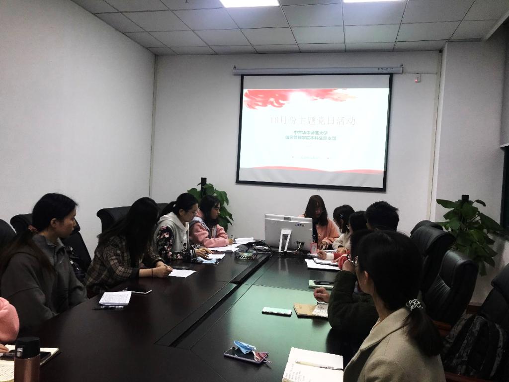 (通讯员 彭泽)2020年11月3日,中共华中师范大学信息管理学院本科生党支部10月党日活动在学院10063会议室顺利进行,活动由党支部宣传委员武晓红同志主持,党支部书记卢旺同志和支部其他党员同志参加了此次活动。