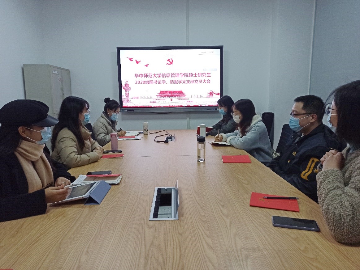 (通讯员 彭思源)2020年12月10日晚7点30,信息管理学院2020级图书馆学、情报学党支部讨论张荣丽同志能否如期转正的党员大会在南湖综合楼10038党员活动室顺利开展。会议由图书馆学、情报学党支部书记王妞妞同志主持,支部全体党员参加。