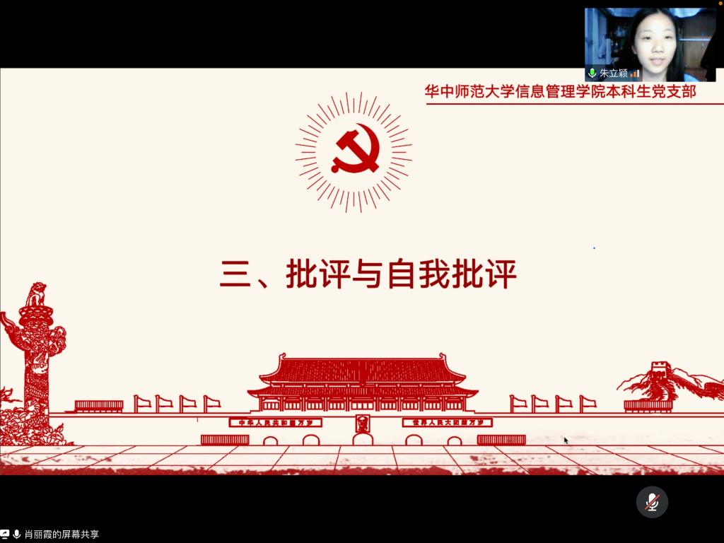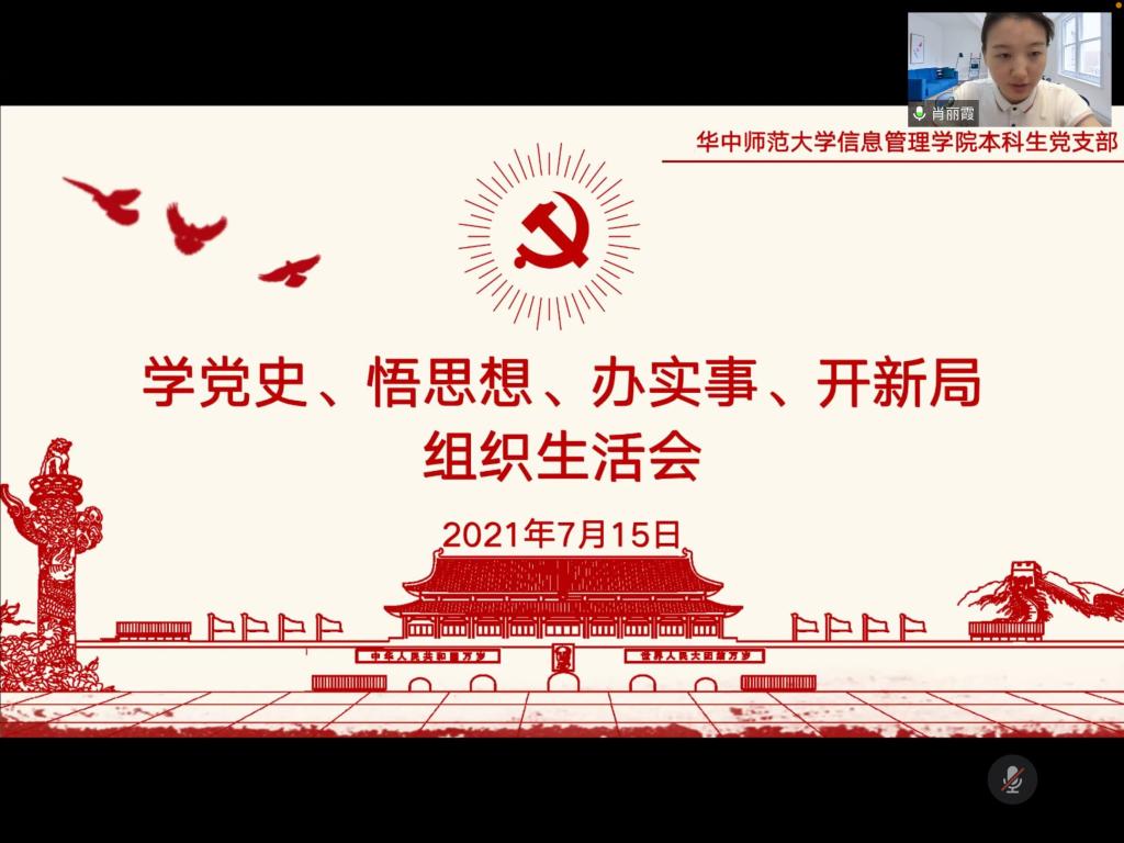 (通讯员 李雪漫 夏春秋)2021年7月15日,中共华中师范大学本科生支部委员会线上党史学习教育专题组织生活会顺利进行,活动由本科生党支部书记肖丽霞同志主持,院党委委员蒋可鸣及支部全体党员同志参会。