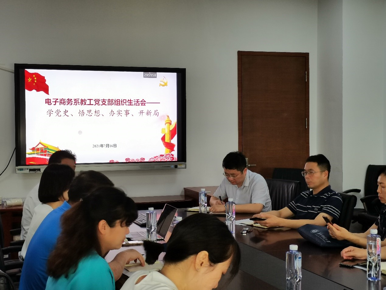 7月16日上午10:00,电子商务系教工党支部在南湖综合楼10003会议室召开党史学习教育专题组织生活会,学院领导班子成员参加会议。