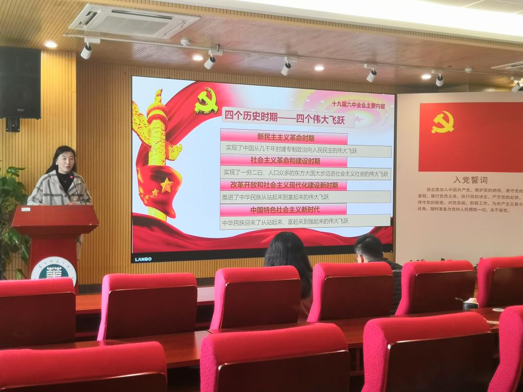 活动的第一项是对十九届六中全会的主要内容进行学习。肖丽霞同志首先回顾了党走过的四个历史时期——新民主主义革命时期、社会主义革命和建设时期、改革开放和社会主义现代化建设新时期以及中国特色社会主义新时代。这四个历史时期是党史和近代史上的四个伟大飞跃,见证了党带领人民从站起来、富起来到强起来的伟大奋斗过程。随后,肖丽霞同志进行了全会内容精神的讲解,包括“三个需要”“十个坚持”等。在讲解过程中,肖丽霞同志将全会精神和支部同志的实际情况结合起来,关系到同志们生活方方面面,给支部同志以较多的启示。