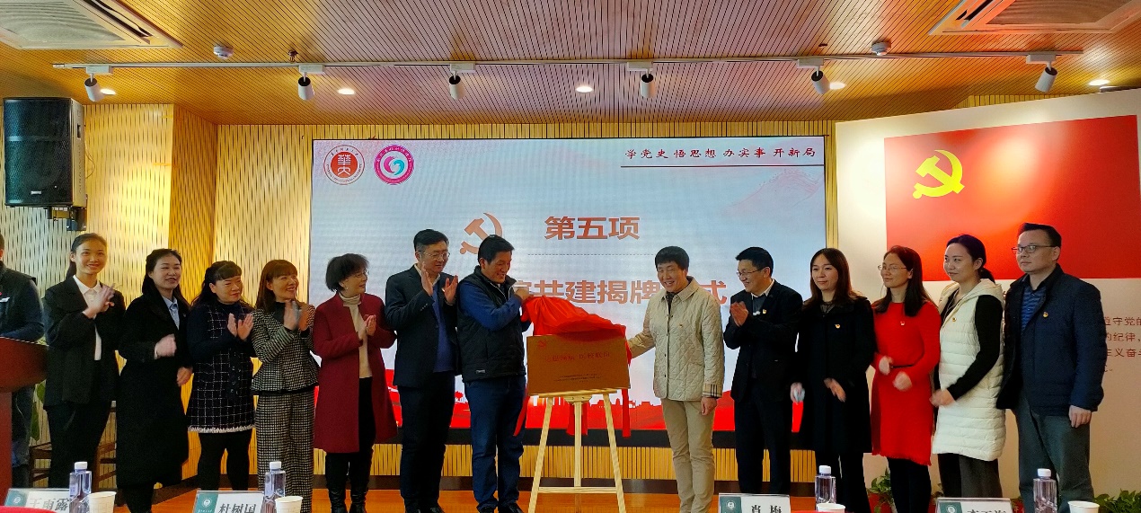 会议第五项,省妇幼保健院产科与会嘉宾与信息管理学院信息资源管理系教工党支部成员共同举行联谊共建揭牌仪式。希望此次活动能够深化医校间的交流学习,并本着以共建促党建、以共建促发展的原则,继续深化“为群众办实事”。