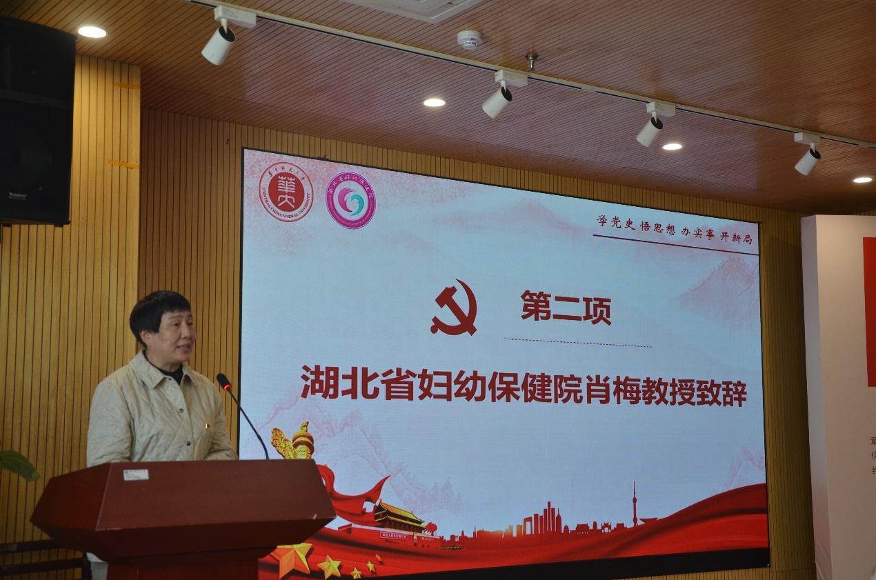 会议第二项,湖北省妇幼保健院产科专家肖梅主任致辞。肖主任表示作为一名有46年党龄的老党员,她很荣幸能在建党百年之际代表省妇幼保健院产科与华师信息管理学院携手一道推进党史学习教育切实走深走实,并希望此次医校党建共建联谊能凝聚双方合力,进一步深化服务水平。她表示,妇幼全体产科人愿意以专业的产科知识和有温度的服务在双方之间建立起良好的信任与深厚的友谊。
