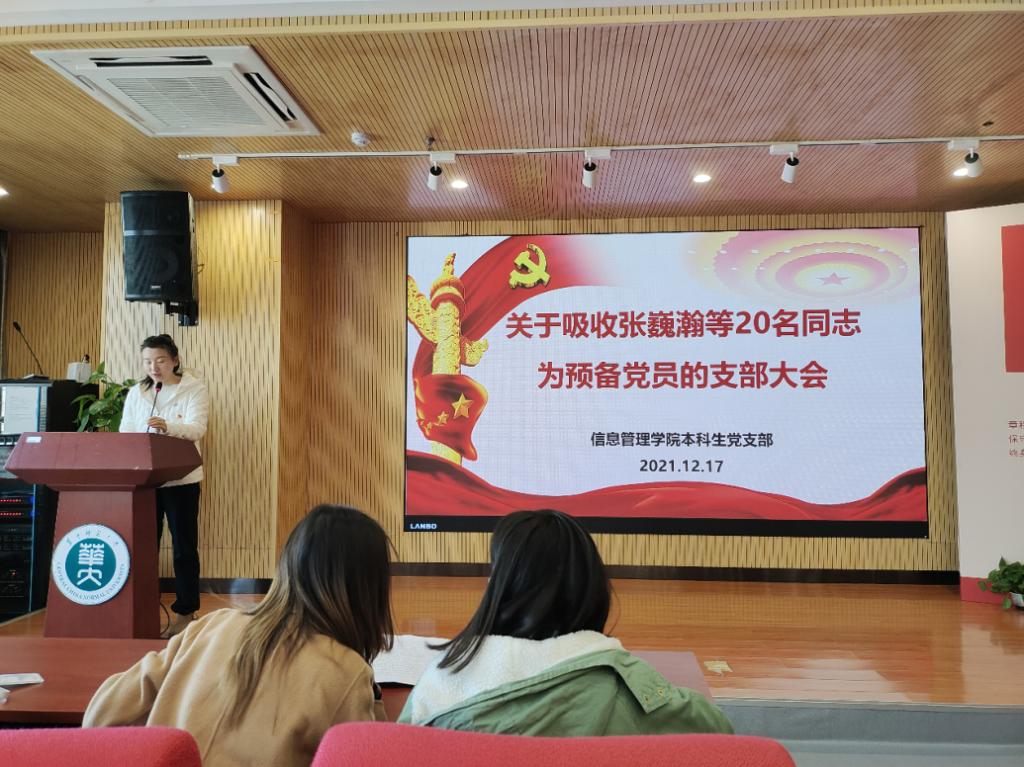 (通讯员 隋东言 谢黛琳)12月17日中午,华中师范大学信息管理学院本科生党支部预备党员吸收大会暨特色党日活动在南湖综合楼10001会议室举行。会议由党支部书记肖丽霞同志主持。