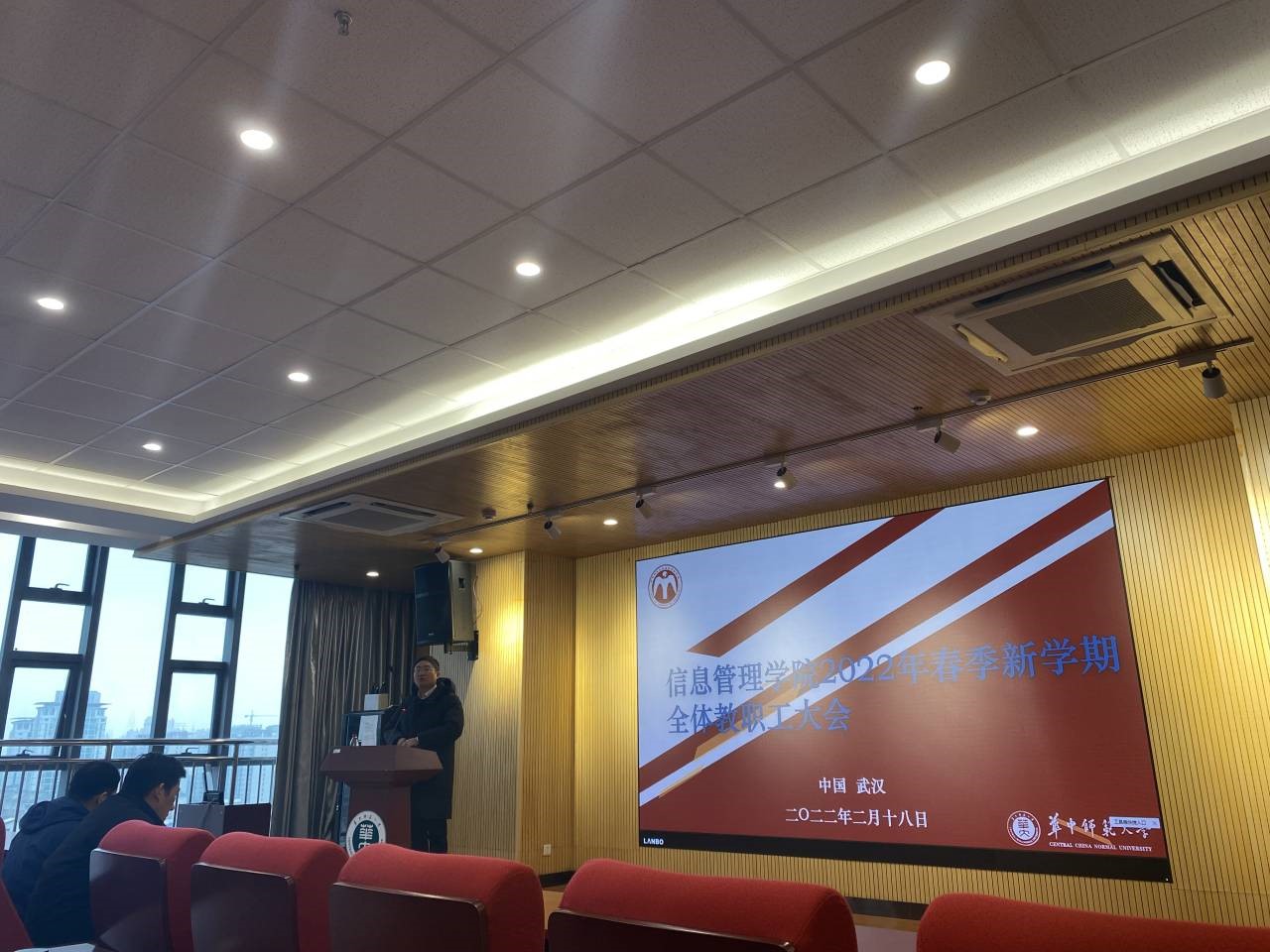 (通讯员 蒋可鸣 魏锦钰)2022年2月18日下午,信息管理学院在南湖综合楼10001报告厅召开2022年春季新学期全体教职工大会,学院领导班子、院党委委员及学院全体教职工参加了本次会议。会议主要对学院上学期及寒期工作进行总结,学习并对标教育部2022年工作要点,对本学期的工作进行部署。会议由信息管理学院党委书记王雨露主持。