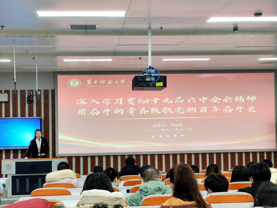 (通讯员:薛建伟)为充分深入学习贯彻党的十九届六中全会精神,信息管理学院团委于12月12日下午17:30在N319和N301教室开展十九届六中全会精神宣讲活动,团委书记肖丽霞、副书记蒋可鸣分别于本科生各年级进行宣讲。全体本科生参加本次分享会。