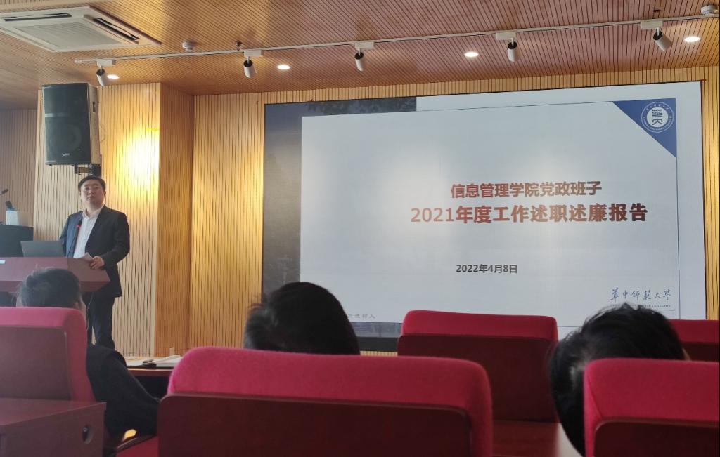 会议伊始,校党委组织部肖微传达了华中师范大学中层领导班子和领导干部年度考核工作要求。随后,院党委书记王雨露代表学院领导班子作2021年度工作报告。他从2021年度学院主要工作、存在的突出问题及下一步工作打算三方面进行了述职述廉报告。2021年,学院党委按照学校党委要求和工作部署,推动全面从严治党落地生根,在抓实党史学习教育、抓好党的全面领导、抓牢学院基层党组织建设、抓稳立德树人根本任务、抓紧安全稳定重要工作、抓严全面从严治党等重点任务方面都取得显著成效。针对学院存在的问题,他表示学院在完善工作总体设计、规范党建工作机制、加强基层组织活力、加强学科和人才队伍建设方面有待进一步提升。下一步,学院将从创建文化信管、推进从严治党、加快高质量发展、聚焦队伍建设等方面下功夫,推动学院各项事业的高质量发展。