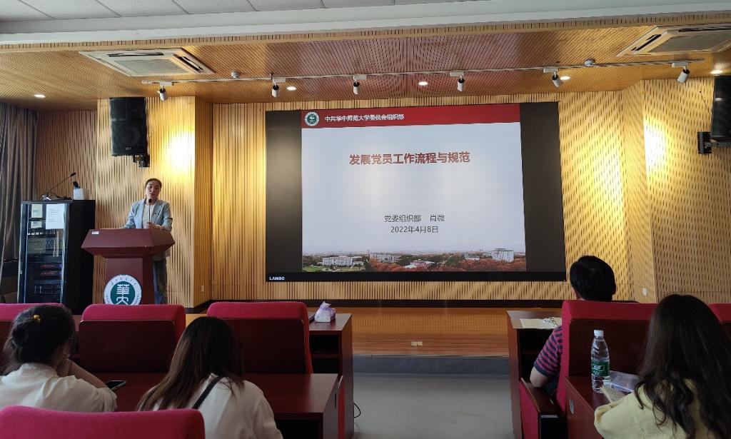 随后,肖微围绕“发展党员工作流程与规范”进行专题培训。肖老师以《中国共产党普通高等学校基层组织工作条例)》为出发点,强调了发展党员培养教育与考察工作的重要性,总结了发展党员工作要“控制总量、提高质量、优化结构、发挥作用” 的十六字方针。接着,她向大家系统、详细地解读了发展党员工作流程的5个步骤、25个环节,结合具体要求强调了每个环节及关键时间节点的注意事项。然后,她针对发展党员过程中常见的如“关于延长预备期”“出国(境)预备党员转正手续办理”等具体问题进行了详细的解答。最后,她详细介绍了《入党志愿书》、《入党积极分子和发展对象培养考察表》、《预备党员培养考察表》等党员材料的填写规范和注意事项。