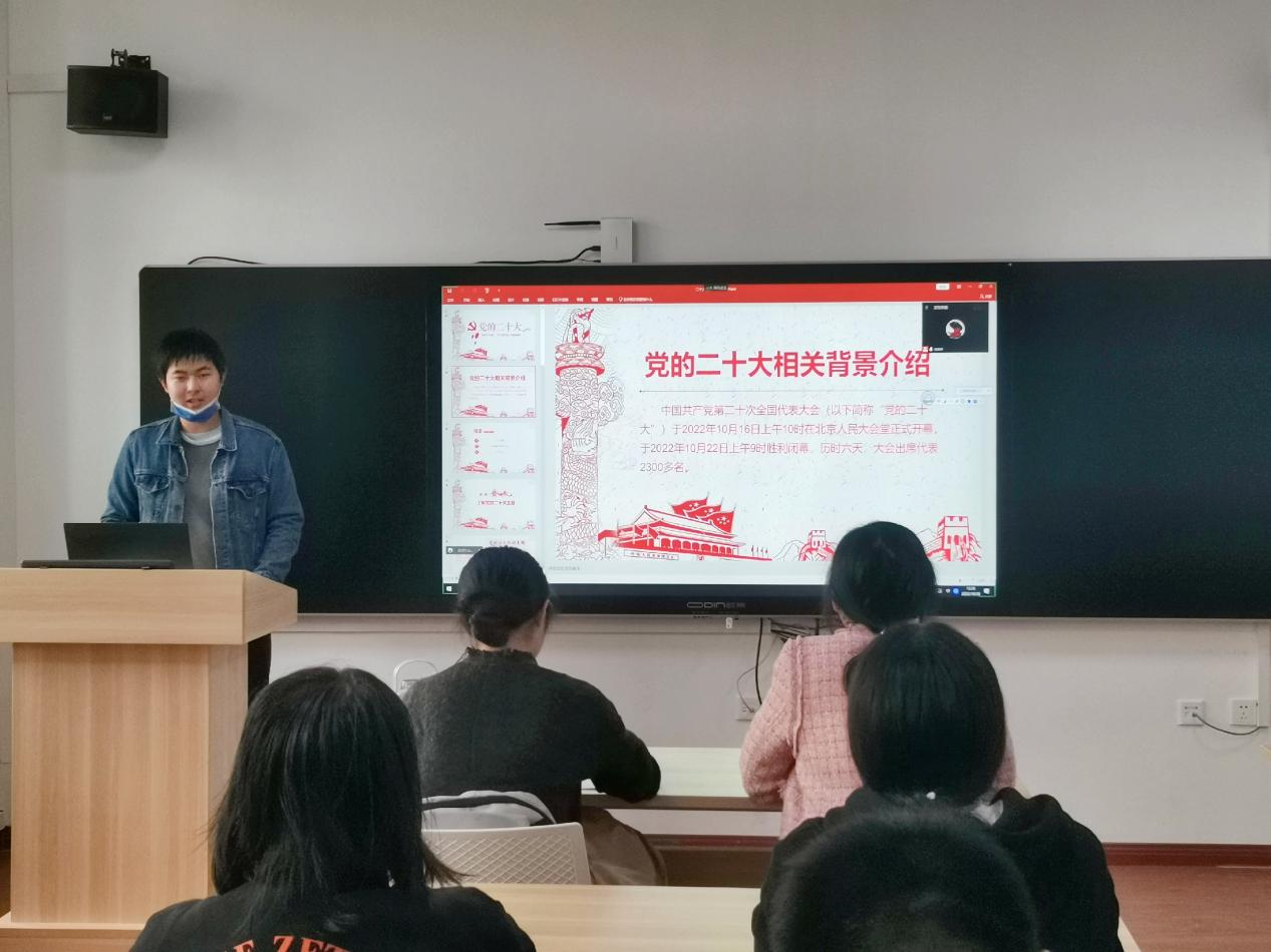 在重温入党誓词,学习《党章》节选内容后,活动正式开始。本次活动采用小组“自主学习+分享”模式,做到了主动学、深入学、带领学。张巍瀚同志带领大家学习党的二十大的内容。他先简要介绍了党的二十大召开的背景和党的二十大的主题,讲解了二十大制定的全面科学的行动纲领和大政方针。在分享过程中,张巍瀚同志着重解读了二十大在新时代的重大意义,作为青年,我们要按照中国式现代化的本质要求,积极投入到新时代党和国家事业发展的建设当中。