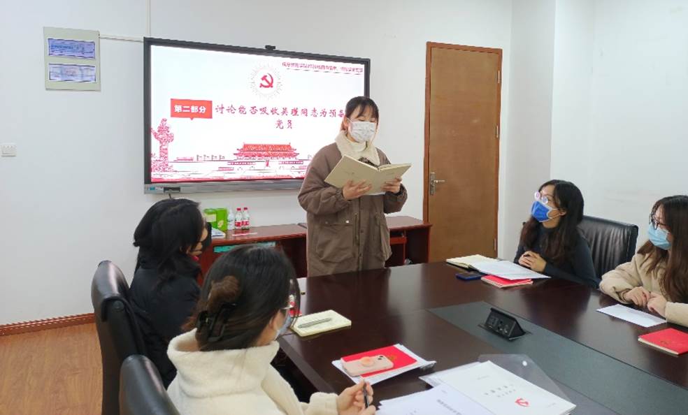 接下来由入党介绍人介绍发展对象有关情况,张荣丽和孙艳玲同志分别介绍了吴瑾同志的培养、教育和考察情况,其中张荣丽同志说到吴瑾同志入党动机端正,入党信念坚定,在学习科研方面成绩优异,在学生工作上热心服务群众,发挥模范带头作用,已经基本具备党员条件,愿意介绍其入党。随后,支委会报告对发展对象的审查情况,认为吴瑾同志政审合格,提交支部大会讨论接收该同志为预备党员。最后与会党员讨论并发表意见,李玥澎同志认为该同志表现优秀,在学生干部工作中尽职尽责,热心助人,体现了党员积极向上的风貌。经与会正式党员无记名投票表决,同意吸收吴瑾同志为预备党员。