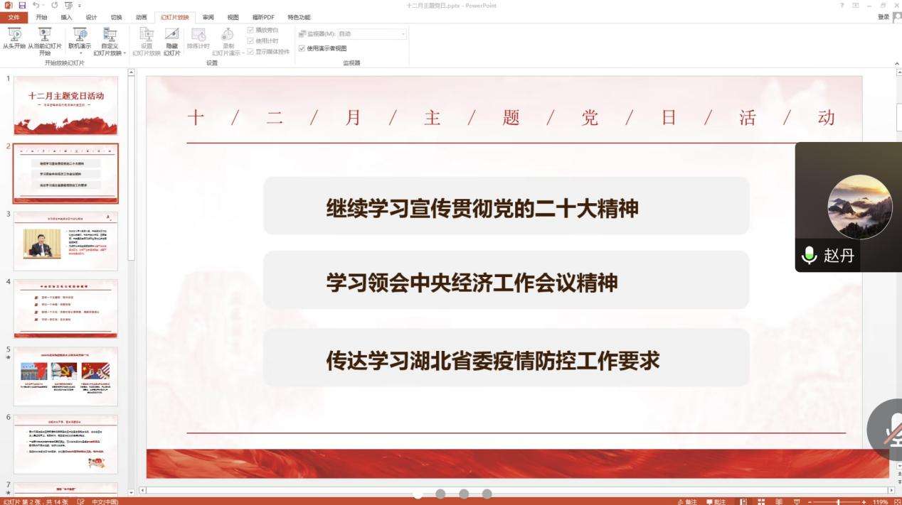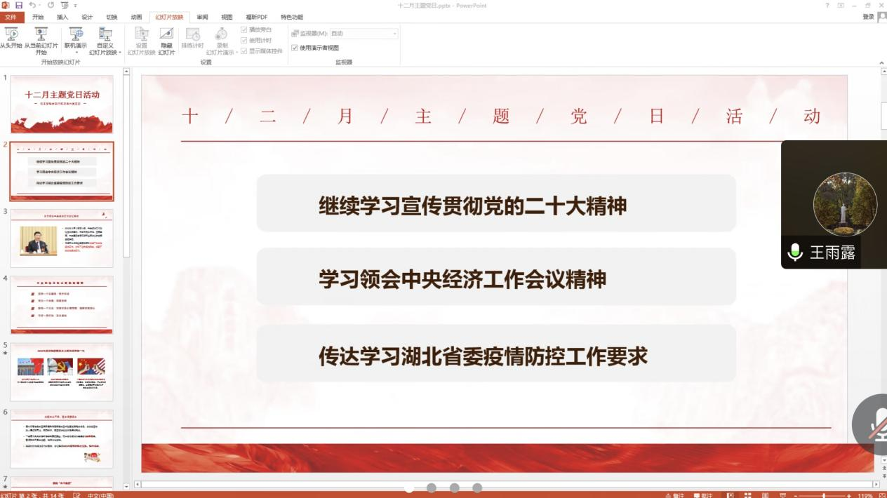 党支部书记王丹同志领学本次会议内容。与会成员学习贯彻党的二十大精神,随后重点学习领会中央经济工作会议精神,传达学习湖北省委疫情防控工作要求。集中学习结束后,与会成员就学习内容分享心得及体会。