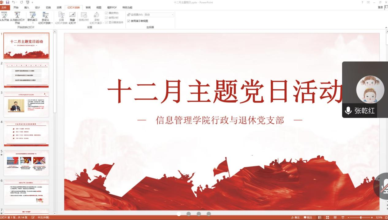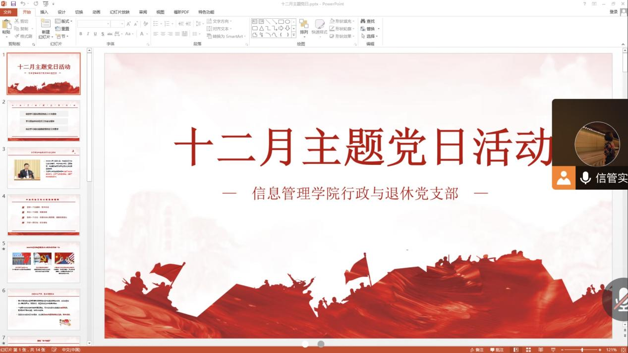 (通讯员 吴佳琦)12月29日下午,信息管理学院行政与退休党支部于腾讯会议开展12月份支部主题党日活动,支部成员线上参会,会议由党支部书记王丹同志主持。