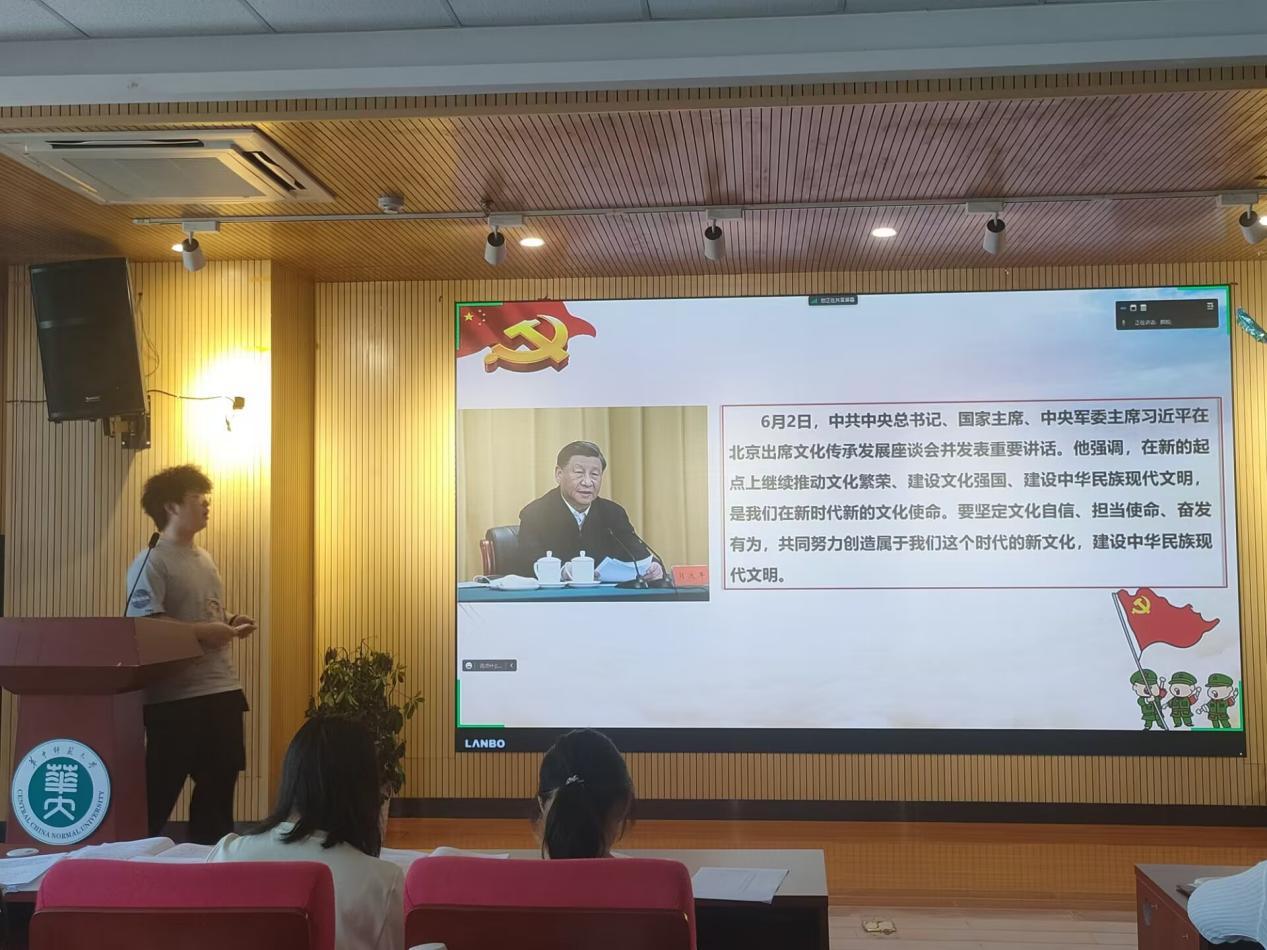 随后,刘坤华同志继续领学“习近平总书记在文化传承发展座谈会上的重要讲话精神”。他介绍中华文明的五个突出特性:连续性、创新性、统一性、包容性、和平性,并强调在工作生活中理解中华优秀传统文化是与马克思主义基本原理的结合其中的关系与内涵。