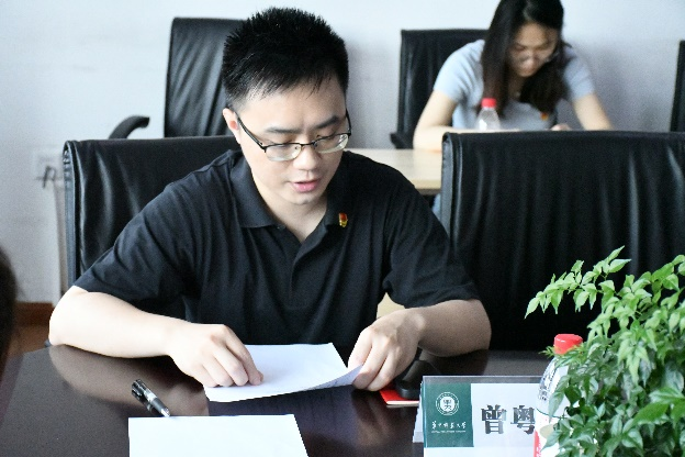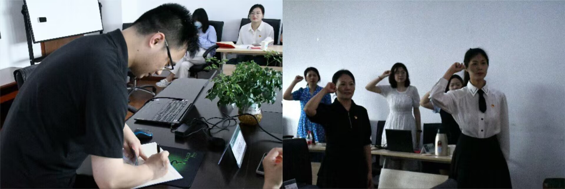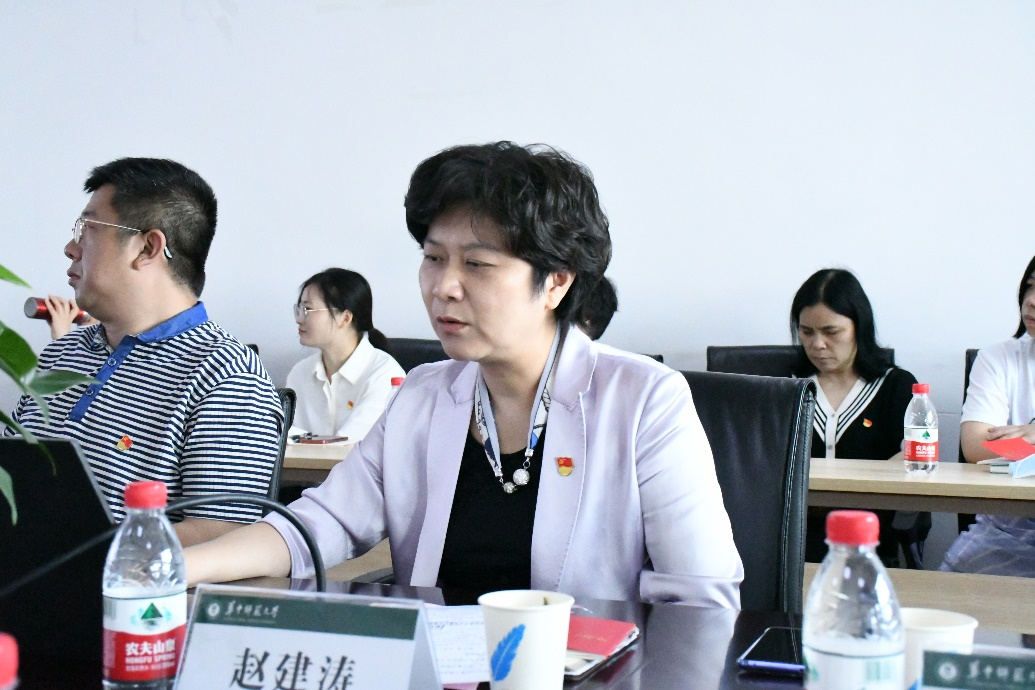首先,王雨露同志介绍到会人员,对武汉市卫生健康信息中心一行表示热烈的欢迎。然后,大家一起观看了信息管理学院宣传片,王雨露同志简要介绍了学院的办学历程和发展现状。接着,现场组织缴纳党费和重温入党誓词活动,重温入党誓词环节由华中师范大学信息管理学院赴新疆参加研究生支教团的毕业生杨天卓同学领誓。