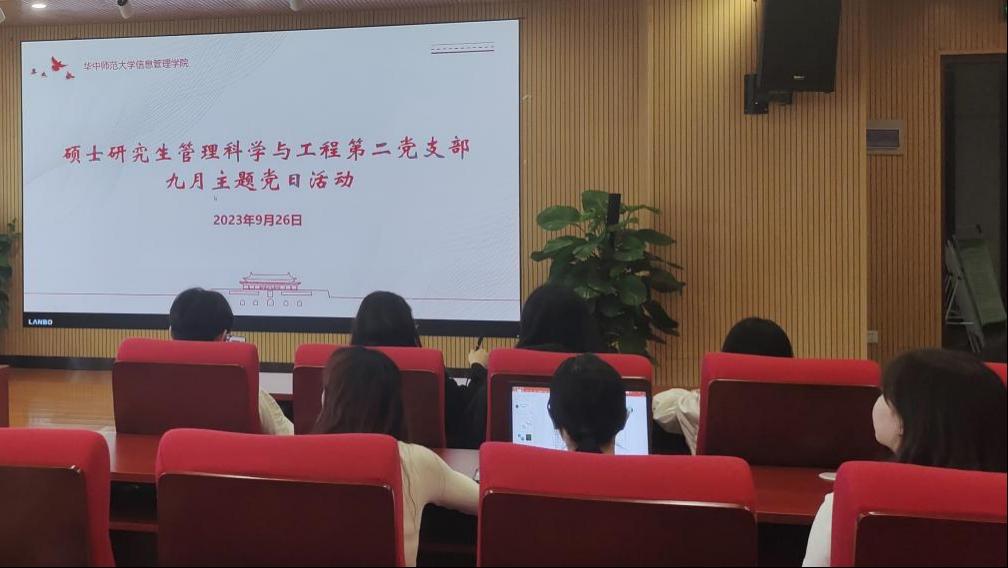 (通讯员 易方兴)2023年9月26日下午,信息管理学院硕士研究生管理科学与工程第二党支部于南湖综合楼N10001报告厅顺利开展了9月主题党日活动。本次活动由党支部书记刘奥同志主持,党支部全体党员同志参加,主要围绕学习领会习近平新时代中国特色社会主义思想主题教育第一批总结暨第二批部署会议精神、学校学习贯彻习近平新时代中国特色社会主义思想主题教育总结会议精神和习近平总书记教师节重要指示精神共三个方面展开。