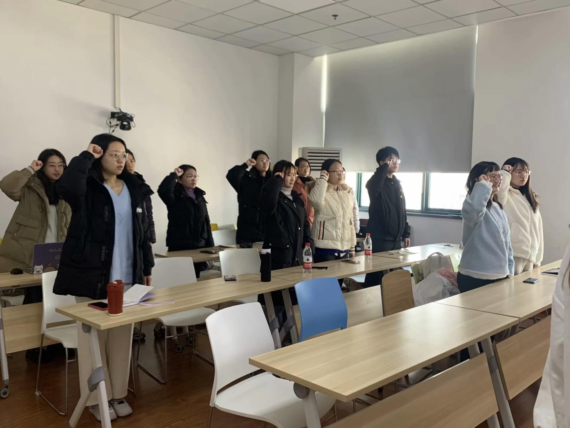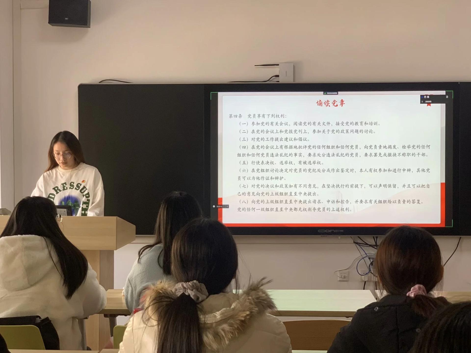 会议伊始,盛思瑶同志带领全体党员同志重温入党誓词,“我志愿加入中国共产党……随时准备为党和人民牺牲一切,永不叛党。”在盛思瑶同志的带领下,支部全体党员面对鲜红的党旗和庄严的誓词,共同高举右拳,庄严宣誓。接着她带领支部同志一起诵读《中国共产党章程》的第四条、第五条,明确党员享有的权利和发展党员的流程。