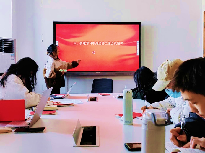 第三个环节,全体党员共同学习中央经济工作会议精神。与会党员认真学习了中央经济工作会议的重要内容,深入领会了中央对于经济工作的总体要求和部署。李雪漫同志表示,作为学生党员,我们要深入领会中央经济工作会议的重要精神,把握经济发展的大势和方向,我们要主动学习新知识,掌握新方法,提高自身素质和能力,积极参与经济建设,为推动经济高质量发展贡献自己的青春力量。