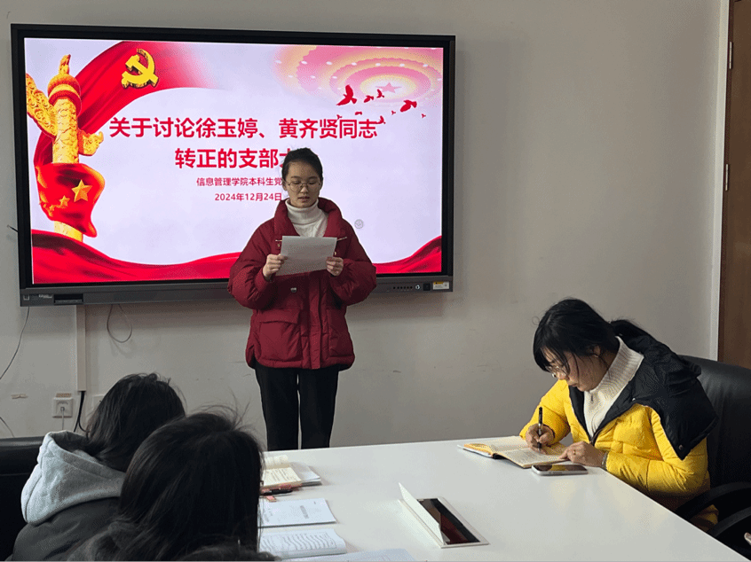 (通讯员 明冉 胡士婷)2024年12月24日,信息管理学院本科生党支部12月主题党日活动暨预备党员转正大会在南湖综合楼N10042教室顺利开展。本次活动由殷芝玲同志主持,支部全体成员参加。