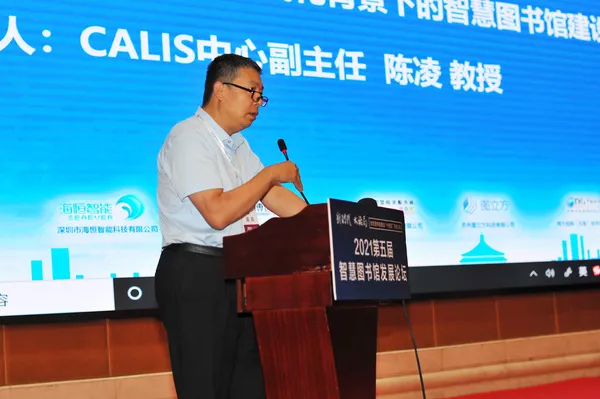 北京大学图书馆研究馆员、教育部高等学校图书情报工作指导委员会秘书长、中国高等教育文献保障系统(CALIS)管理中心陈凌副主任作《立足当下 重构未来——我国教育现代化背景下的智慧图书馆建设》的主题报告,陈教授介绍了教育现代化与图书馆发展趋势及智慧图书馆建设领域的研究心得,并就智慧图书馆建设中存在的一些问题做了探讨。