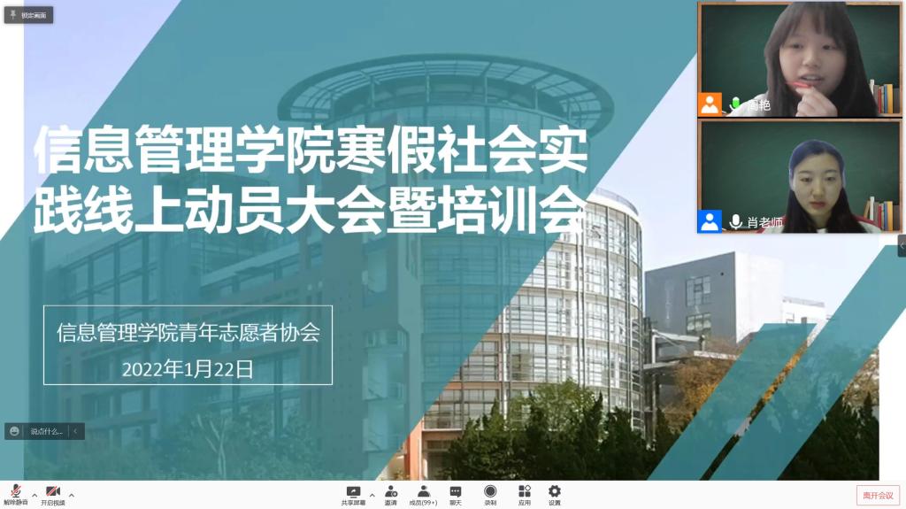 (通讯员 王卢 黄承轩)1月22日上午,为了让同学们更好地了解寒假社会实践内容,积极参与社会实践,信息管理学院举行寒假社会实践线上动员大会暨培训会。信管团委书记肖丽霞、青年志愿者协会负责人周艳主持。信管21级全体同学及18、19、20级同学参加会议。