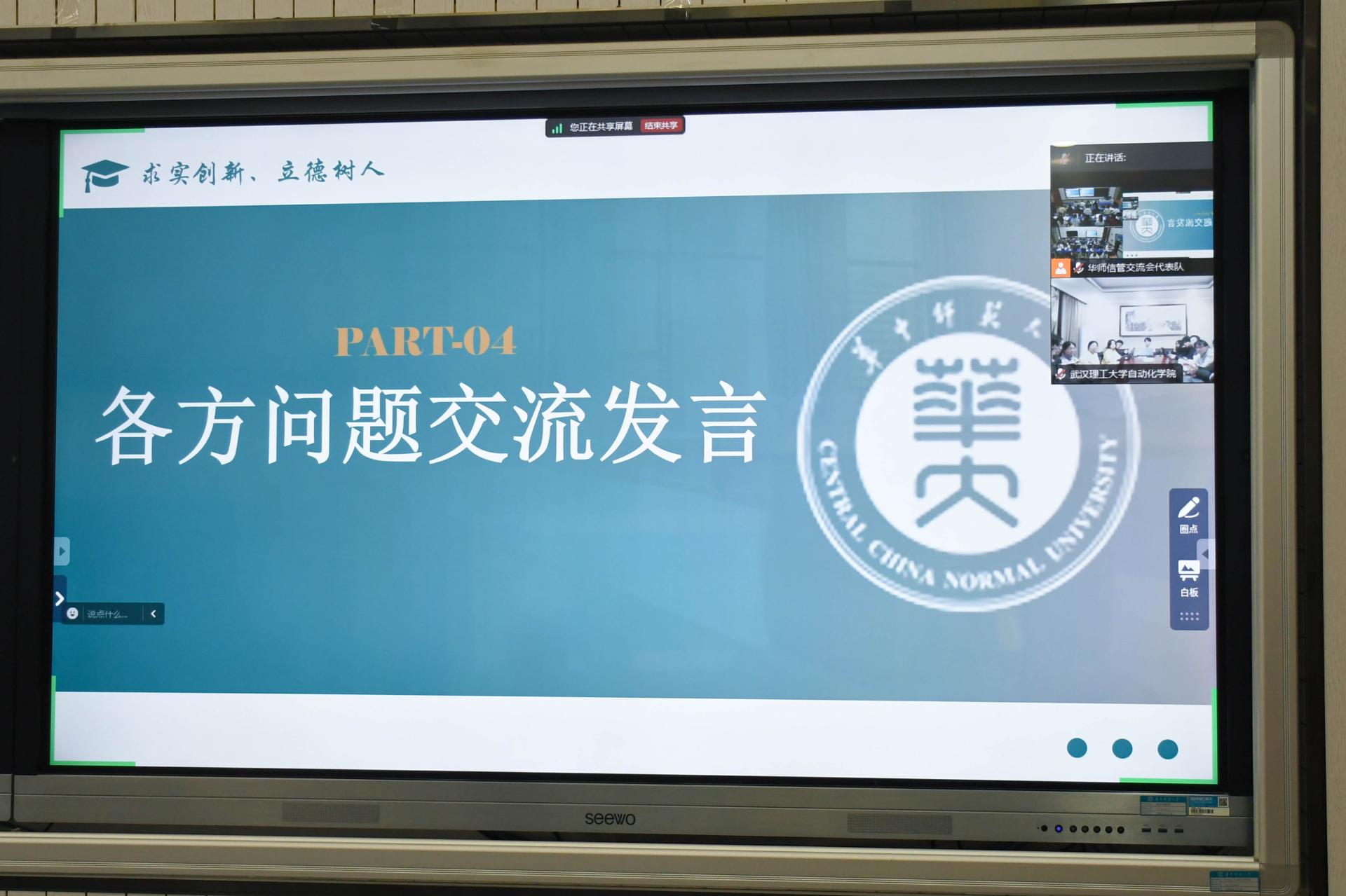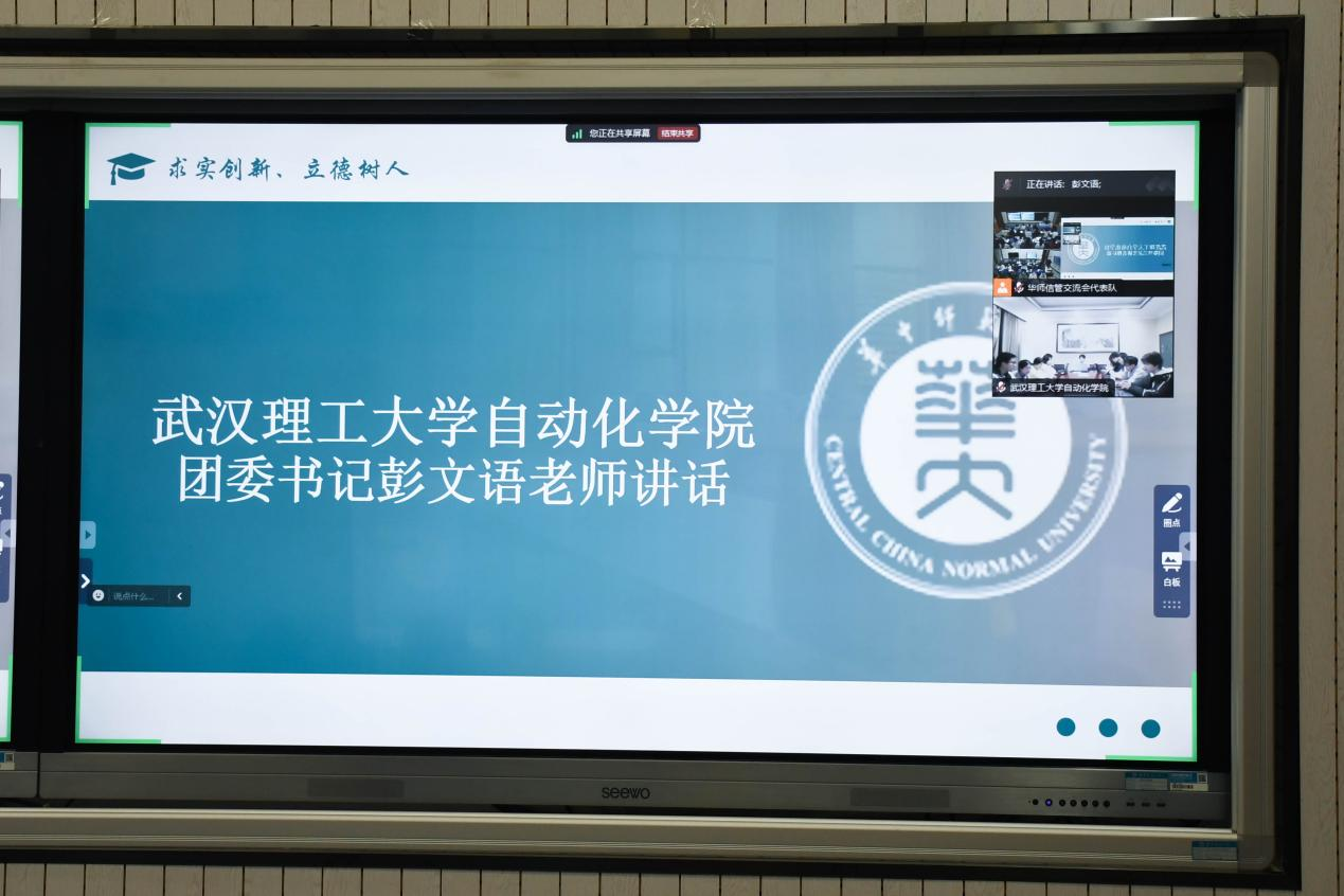(通讯员 寇津赫 梅茹涵)为搭建两院跨校沟通桥梁、互相汲取学生工作经验,11月22日晚,“华师武理云际会,‘自’‘信’交融启慧思”华中师范大学信息管理学院团委学生会与武汉理工大学自动化学院团委学生会工作交流会于线上举行。两院团委学生会主席团和各部门代表参与本次交流,我院成员于南湖综合楼n110教室集中参会。华中师范大学信息管理学院团委书记王乐、武汉理工大学自动化学院团委书记彭文语出席了本次会议。交流会由2024级本科生钱诺成主持。