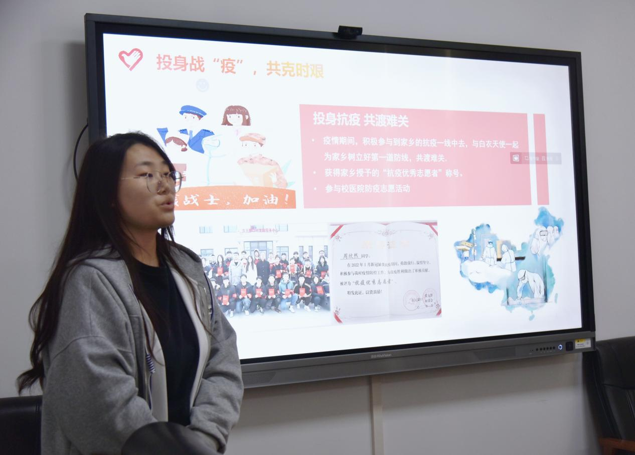 12位候选人结合自身实际,从学业情况、志愿经历、心得体会等方面进行自我剖析。2022级信息资源管理专业本科生王梓妍在2022-2023学年综合成绩排名专业第七,她积极参加校级、院级科创竞赛,并获得校级奖项。自2022年9月入学以来,王梓妍累计参与志愿活动25次,累计志愿时长360.5小时。