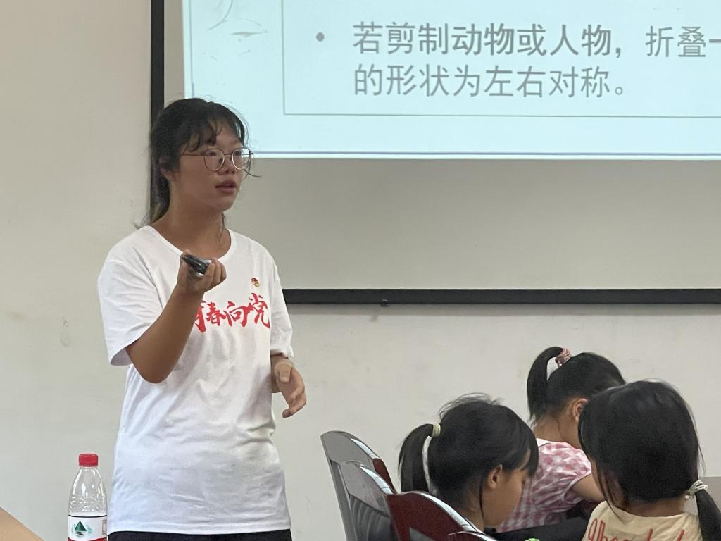 镂金作胜传荆俗,翦彩为人起晋风。剪纸艺术作为传统民间工艺中的瑰宝,在世界艺术宝库中亦有着举足轻重的地位,许许多多的剪纸艺人用一双巧手、一把剪刀和几张纸片,剪出了五彩斑斓的精彩人生。在这堂课中,覃诗为学生们带来的便是中华优秀传统文化——剪纸文化。覃诗为学生们介绍剪纸的相关知识,帮助学生们更好地了解其文化内涵。