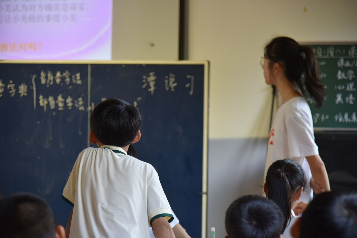 欢声笑语中,学生们在进行画画接龙小游戏。孩子们比划着传达信息,希望下一个人能够猜出所给词,但在传递过程中不免会出现错判。在这个寓教于乐的过程中,轻松愉快的游戏同样蕴含着知识:信息的传递非常重要,影响着最终信息的真实性。一旦某一环节出现问题,最终结果就会有偏差。