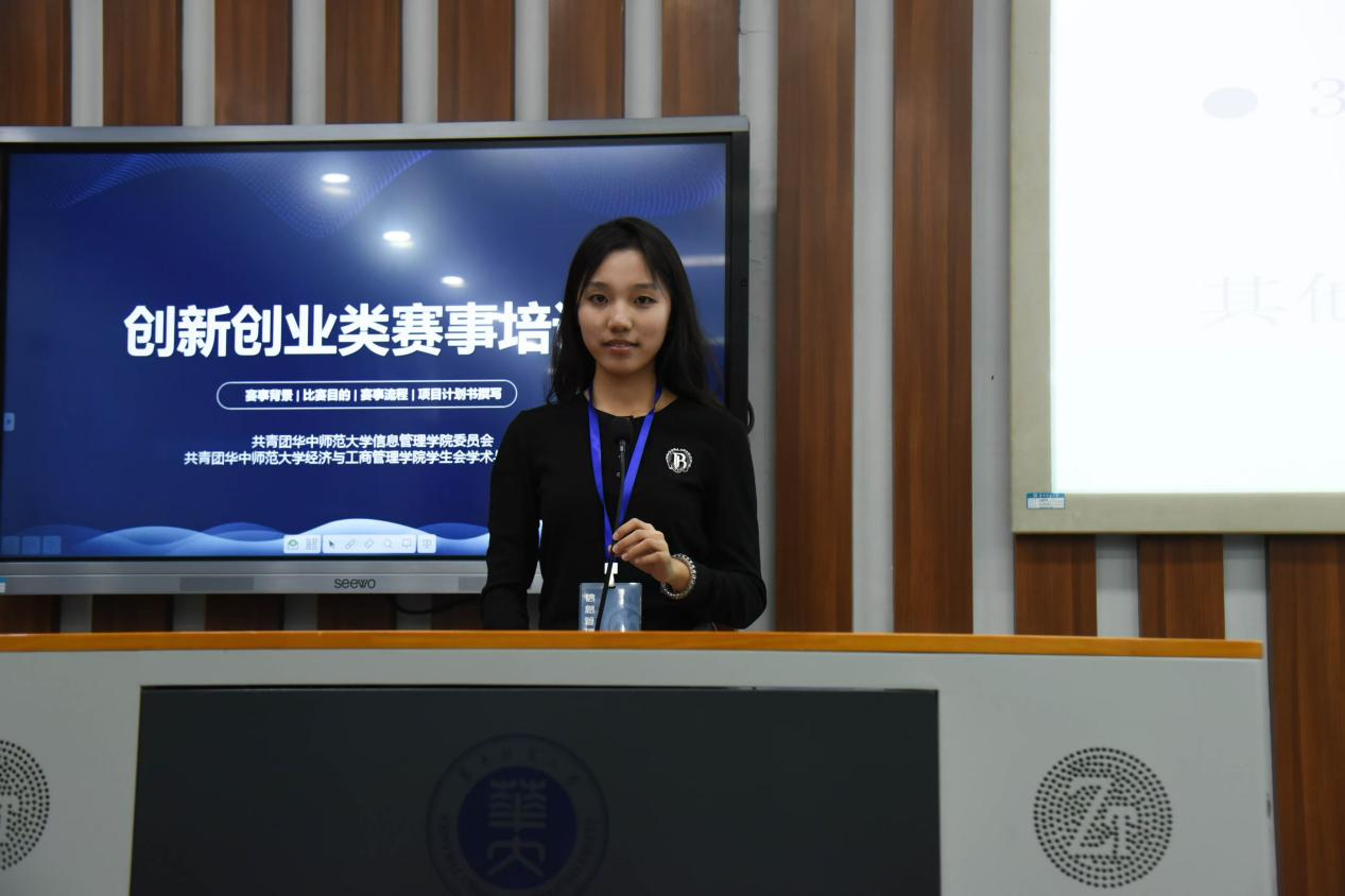会议伊始,张慕颖对到场的同学表示热烈欢迎,并简要介绍了研讨会的流程和目的。随后,研讨会进入了创新创业讲解培训环节。研讨会特别邀请创新创业经验丰富的2023级电子商务专业本科生苏婷展开分享,详细介绍各类创新创业赛事参赛流程和注意事项,并分享自己参与创新创业实践的心得。