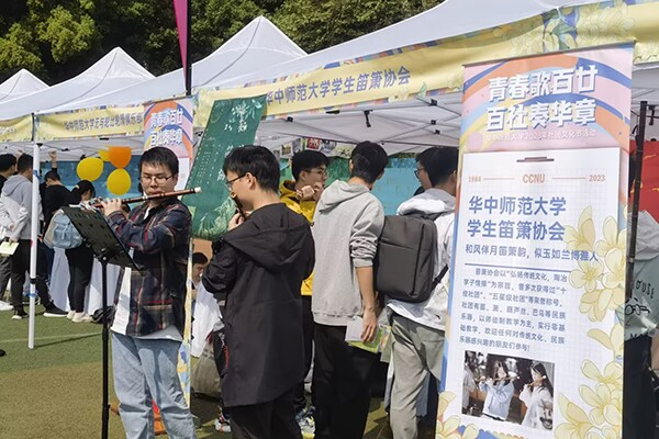 (通讯员 赵文青)4月8日,华中师范大学笛箫协会参与完成2023年“青春歌百廿,百社奏华章”社团文化节活动。会长徐思成及成员孙萌、冯康康、申冬旭等到场组织活动。本次社团文化节的举办不仅让现场的同学收获了欢声笑语,更进一步壮大了社团队伍的规模。