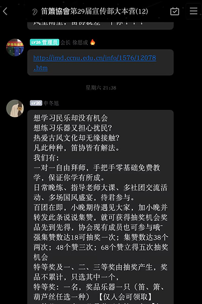 社团的招新工作是本次会议重点谈及内容,也是今后全体理事会成员的主要任务。今年的社团招新工作由于疫情防控等原因不太顺畅,但是协会也在努力激发同学们的兴趣,调动同学们的积极性。谈到具体措施,会长鼓励大家多多宣传自家协会,积极转发协会的抽奖说说,希望能吸引到更多热爱笛箫的同学加入笛箫协会。
