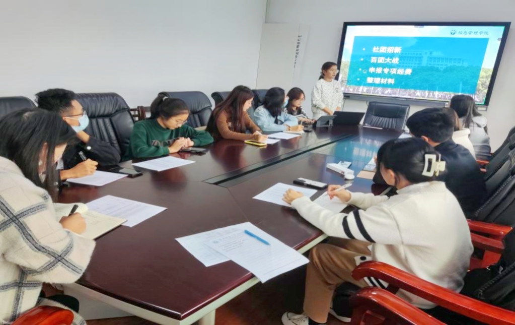 (通讯员 冯文静)10月28号中午,信息管理学院十月社团联席会议于南湖综合楼10063会议室举行。参与本次会议的人员有信息管理学院团委书记肖丽霞,信息管理学院社团联合部全体成员和各挂靠社团主要负责人。