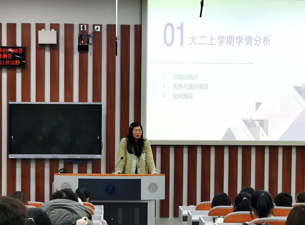 接着,蒋可鸣老师总结了20级同学们大二上学期的考试情况,结合上一学年的成绩对比,分专业、分学科对成绩分布和挂科情况进行了全面分析,并提出了同学们在学业上的待改进之处。蒋可鸣老师对成绩名列前茅的同学和进步显著的同学提出了表扬,鼓励其再接再厉、再创新高;对成绩不理想的同学进行了鞭策和鼓励,激励其奋起直追、力争上游。