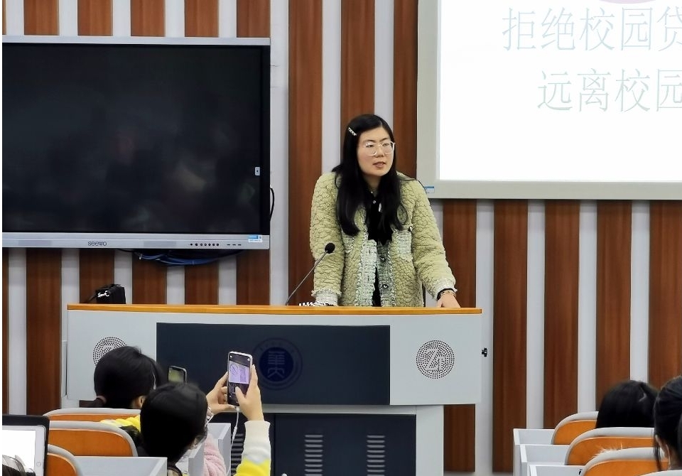 蒋可鸣老师首先向同学们介绍信息管理学院的新任助理辅导员赵晓婷。赵晓婷老师向同学们进行了简单的自我介绍,并且提出与同学们共同进步、共同努力的憧憬。接下来蒋可鸣老师向同学们介绍了校园贷的危害以及诸多相关案例。校园贷就是裹着糖衣的毒药,吸引学生后变相谋取暴利导致一场又一场恶性循环,因此蒋老师呼吁同学们要提高法律意识,坚决抵制校园贷,树立正确的消费观。