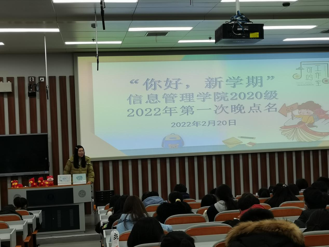 (通讯员 陈静池 刘诗琪)2月 20日晚,信息管理学院2020级全体同学参加由可鸣工作室举办的“你好,新学期”信息管理学院2020级2022年第一次晚点名,此次活动由信息管理学院20级辅导员蒋可鸣主持。