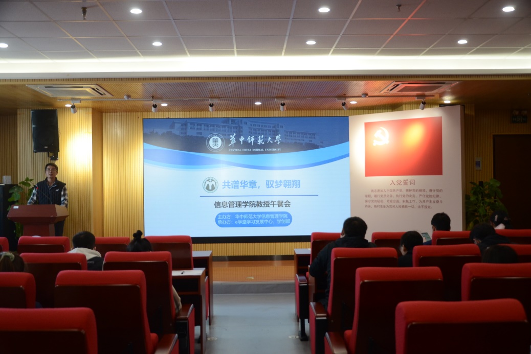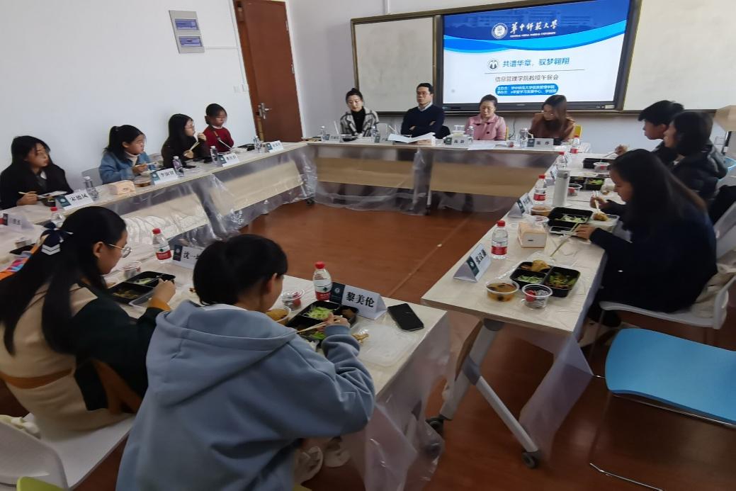 (通讯员 刘希月)11月18日中午,由信息管理学院“e学堂”学习发展中心承办的“共谱华章,驭梦翱翔”教授午餐会在10001、10002、10003和10006举行。参加本次午餐会的有党委副书记王涛、副院长卢新元、信息管理与信息系统系系主任陈静、大数据管理与应用系系主任叶光辉、信息资源管理系系主任王王忠义、电子商务系系主任张珺、信息管理与信息系统系老师陈烨、大数据管理与应用系老师武川、电子商务系老师王萍、信息资源管理系丁恒以及本科生辅导员蒋可鸣、肖丽霞、卢旺及34名同学。