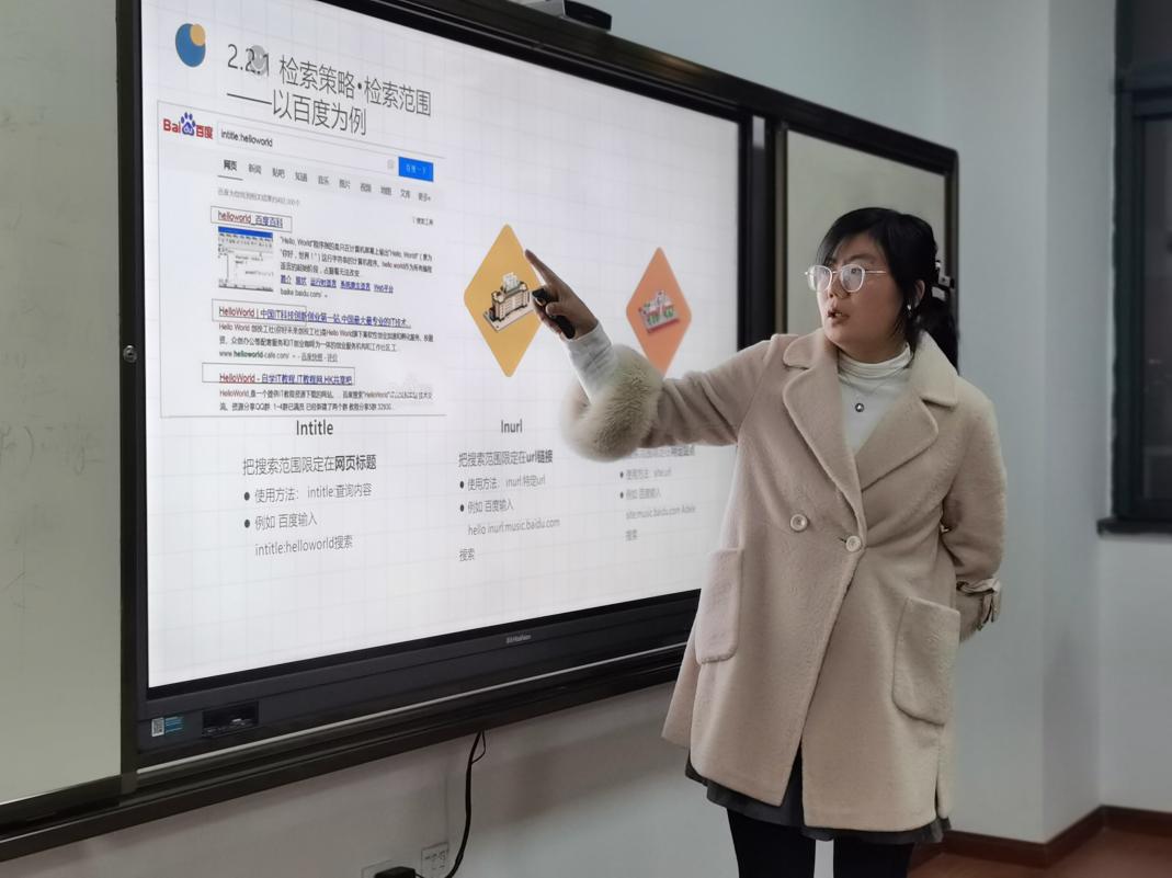 第二部分:方法教授,提高信息检索技巧。在介绍了前提概念之后,蒋可鸣带领着同学们了解搜索引擎,并以百度为例,展示了多个检索策略。她向同学们传授了高效信息检索的方法和步骤:首先需明确搜索目的,然后选择合适的检索系统或工具,最后实施信息检索策略。在传授完方法后,同学们进行了积极的实践,揭俊奕、王乃玉和岳甜等同学上台进行演示。