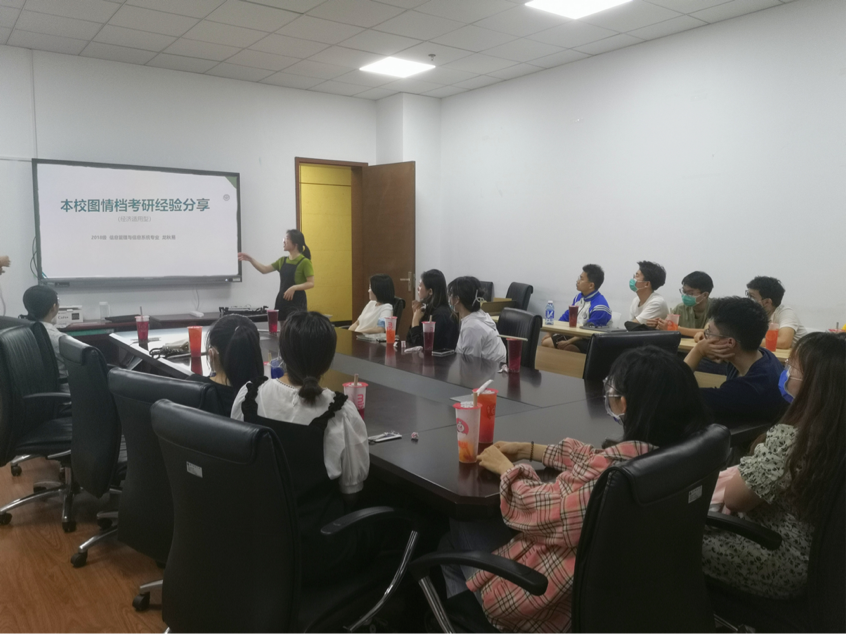 18级信息管理与信息系统专业的学生,上岸本校图书情报与档案管理学硕。龙秋易首先强调了“考研的选择>努力”的观点,她通过自己身边朋友考研目标院校较高,虽然加倍努力最后还是被调剂的例子,劝诫大家在考研之前,一定要根据自己的兴趣和能力选择适合自己的学校和专业。她的分享主要从学硕初试的四个科目入手,为大家详细介绍了各科重点、复习时间以及推荐的资料,同学们都收获颇丰。在总结经验时,龙秋易建议大家做好信息搜集,增强自己的沟通表达能力,为面试做好准备。