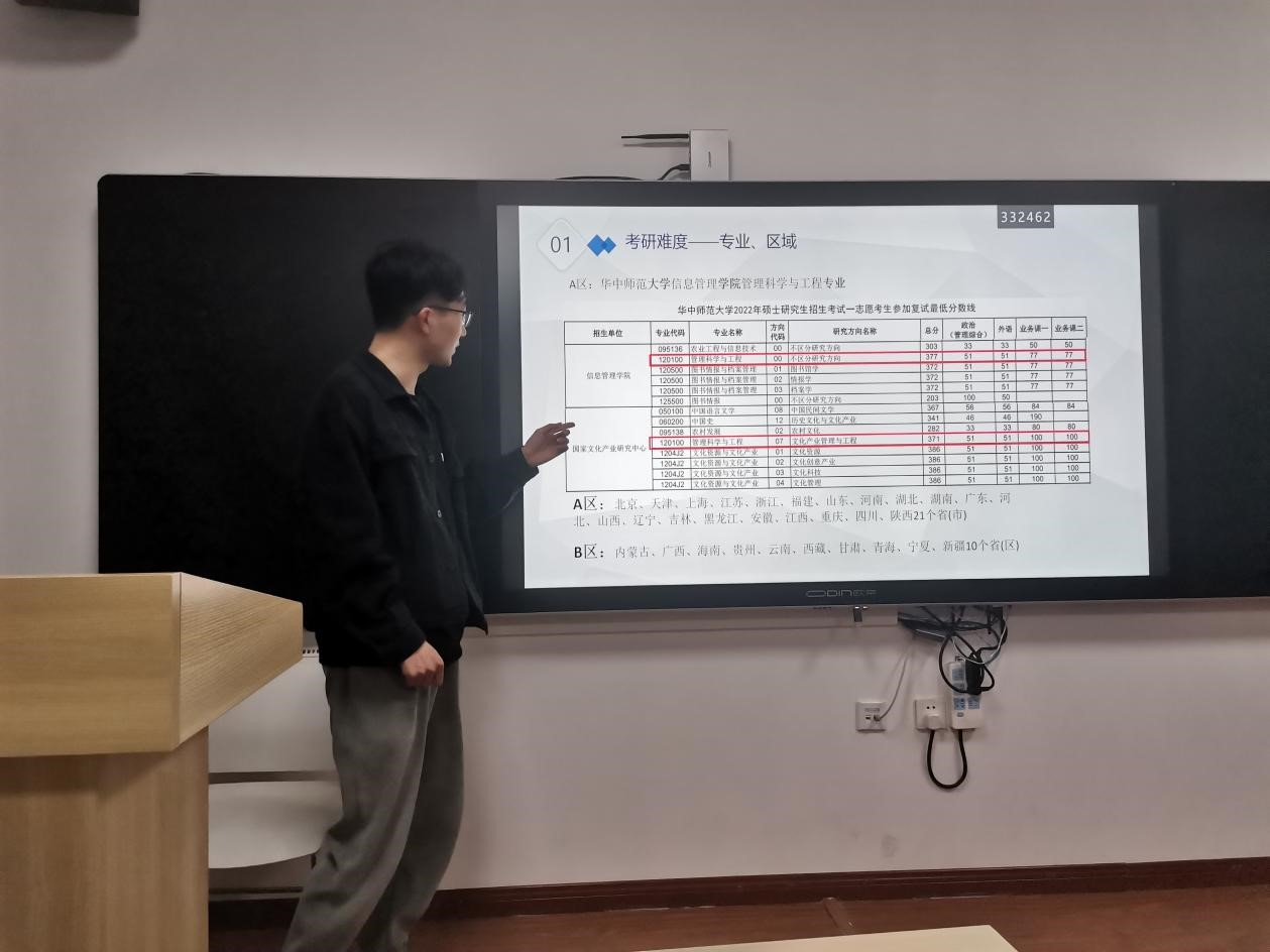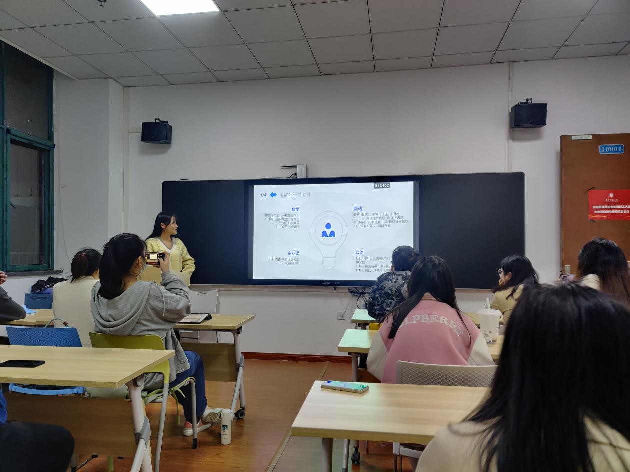 随后,研究生学长学姐代表进行考研经验分享。李章学长介绍了考研科目内容以及学校地区、专业的选择策略,建议结合院校招生人数与自身能力综合考量。其次是考研期间每一科内容的复习计划,应该按照自身能力摸索复习方法,结合相关辅导视频及资料,及时巩固与复盘,合理利用网课资源与线下练习,每一个时间段都有清晰的目标规划。最后张涵学姐分享了有关研究生复试的相关步骤及应对措施,同学们受益匪浅。