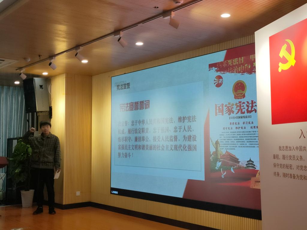 活动伊始,2101团支部青协委员陈立向大家科普了宪法的相关基本概念,重点宣传了习近平新时代中国特色社会主义思想特别是习近平法治思想;党的十九届六中全会精神;中国共产党成立以来、特别是党的十八大以来党领导人民进行法治建设取得的辉煌成就;宪法、民法典等国家基本法律,与推动高质量发展、社会治理现代化密切相关的法律法规和党内法规等。传递着依宪治国、依宪执政的理念。而后陈立同学带领大家向宪法庄重宣誓,在声声坚定的誓言中,同学们提升了倍加珍惜宪法,增强维护宪法尊严、保证宪法实施的自觉性和坚定性。