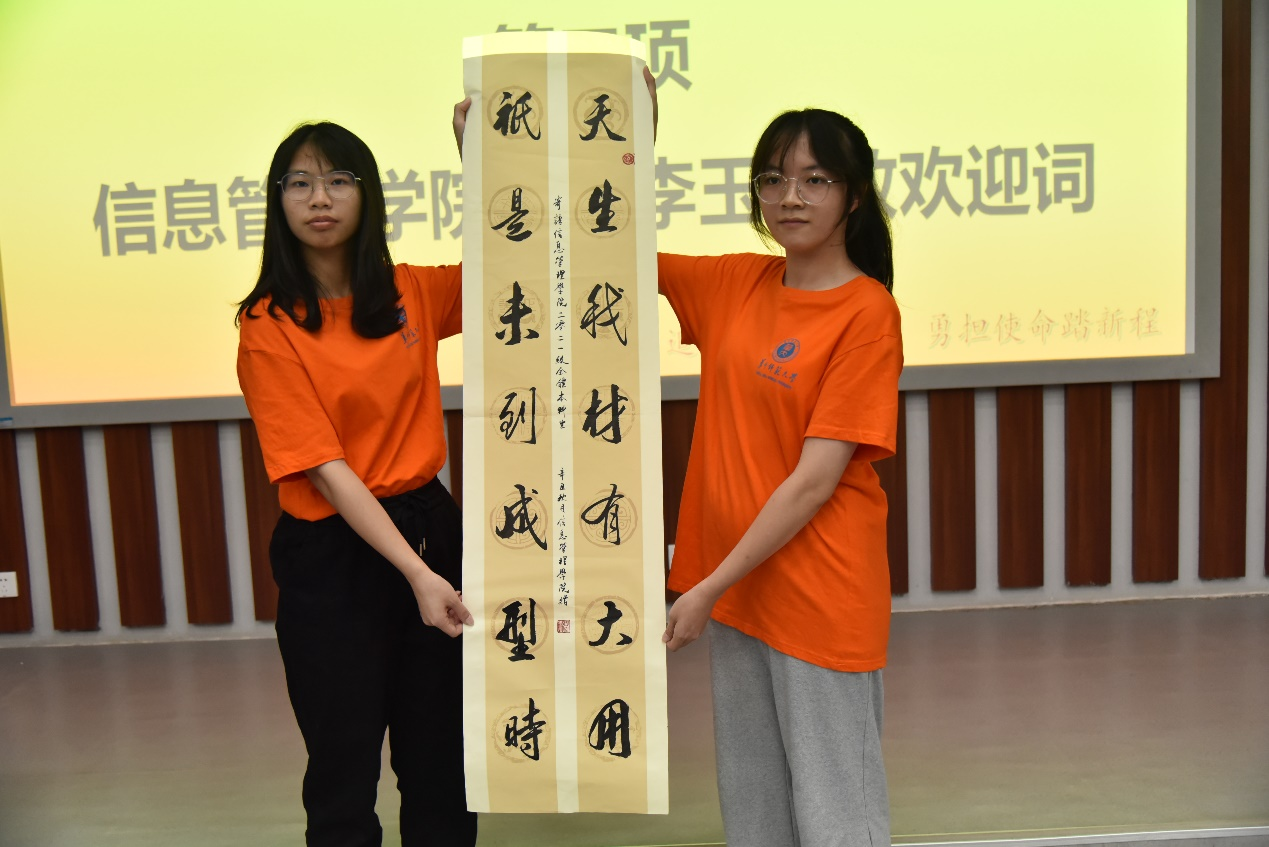 典礼以全体成员奏唱国歌拉开序幕。随后,屏幕上开始播放系主任及班主任对新生的寄语视频,视频中,老师们表示非常欢迎新生们的到来,希望他们在信管的学习生活中真正明白“信息管天下,数据掌乾坤”的含义。典礼正式开始,李玉海首先代表学院讲话。他讲述了信息管理学院创立至今的发展史,在一代又一代人的努力中,信管不断进步和壮大。李玉海为新同学们送上一副毛笔字,勉励同学们在即将开始的大学生活中收获成功。