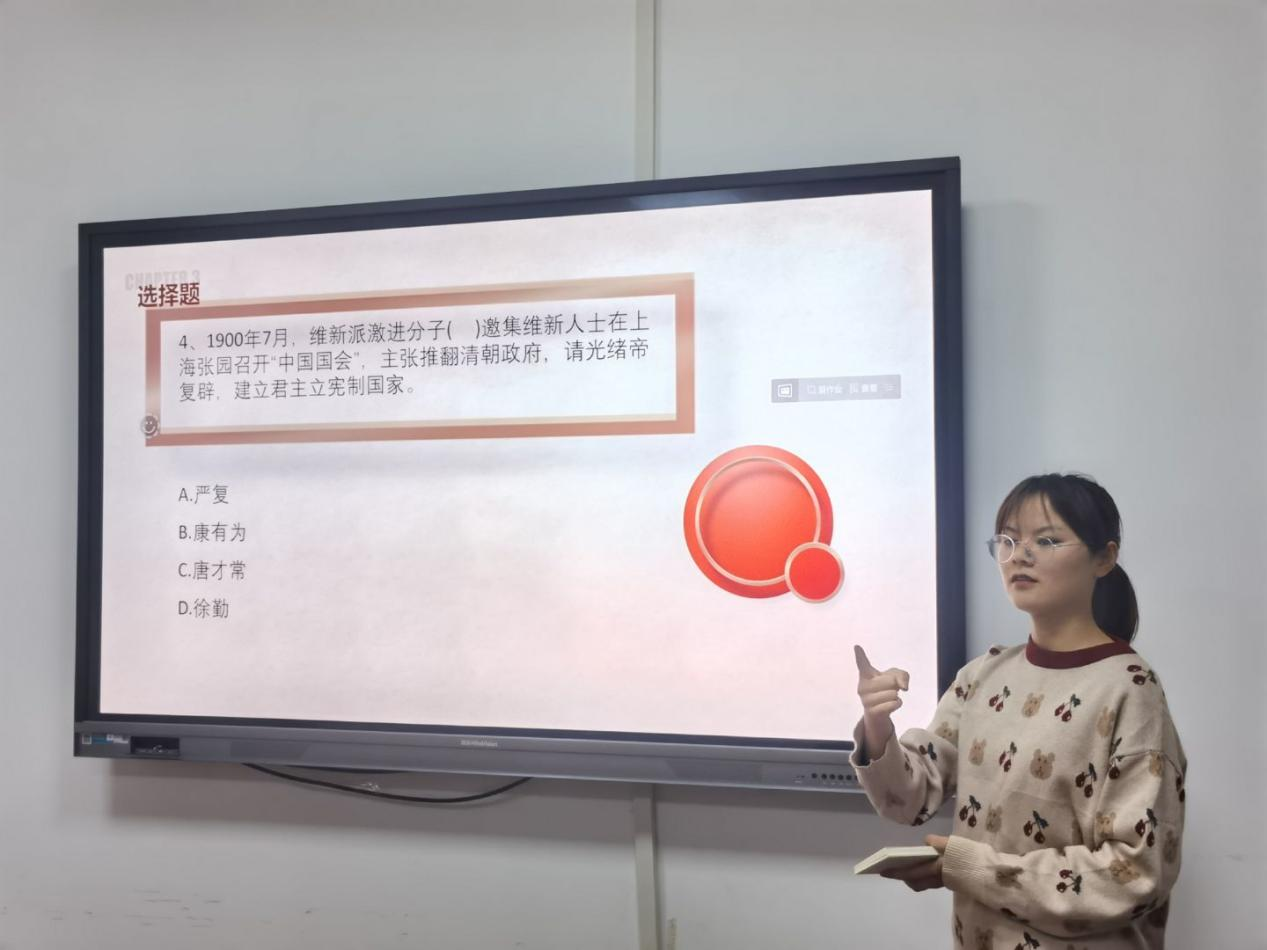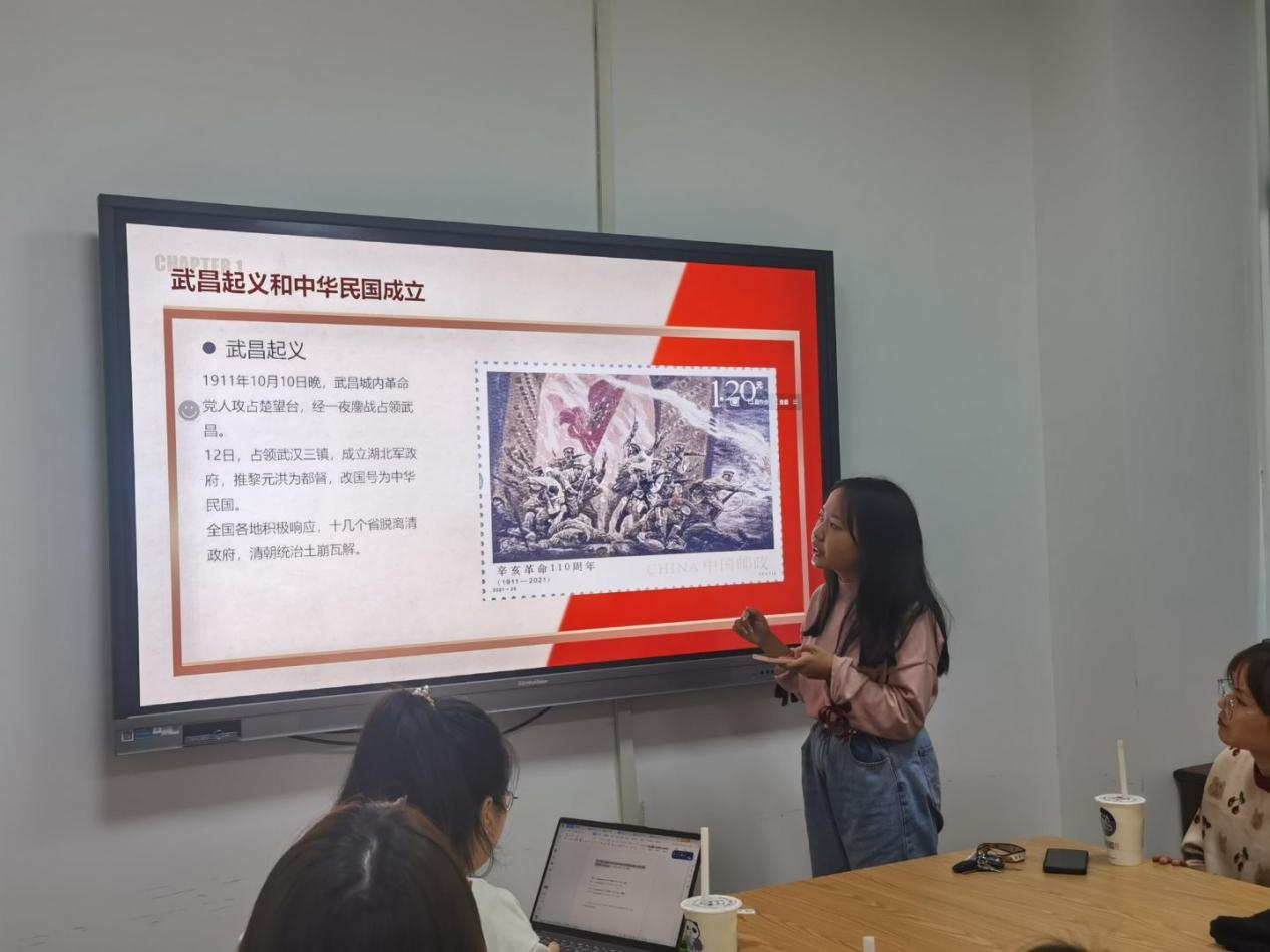 回顾历史环节结束后,同学们共同观看了习近平总书记在纪念辛亥革命110周年大会上的讲话,并进行了轻松活泼的抢答环节。题目皆是由班委们围绕辛亥革命的相关知识精心准备的,答对者可获得精美的历史文化明信片。大家纷纷主动举手抢答,会议室中充满着欢乐的笑声。在趣味十足的小游戏中,同学们对历史事件的相关知识也掌握得更牢固了。