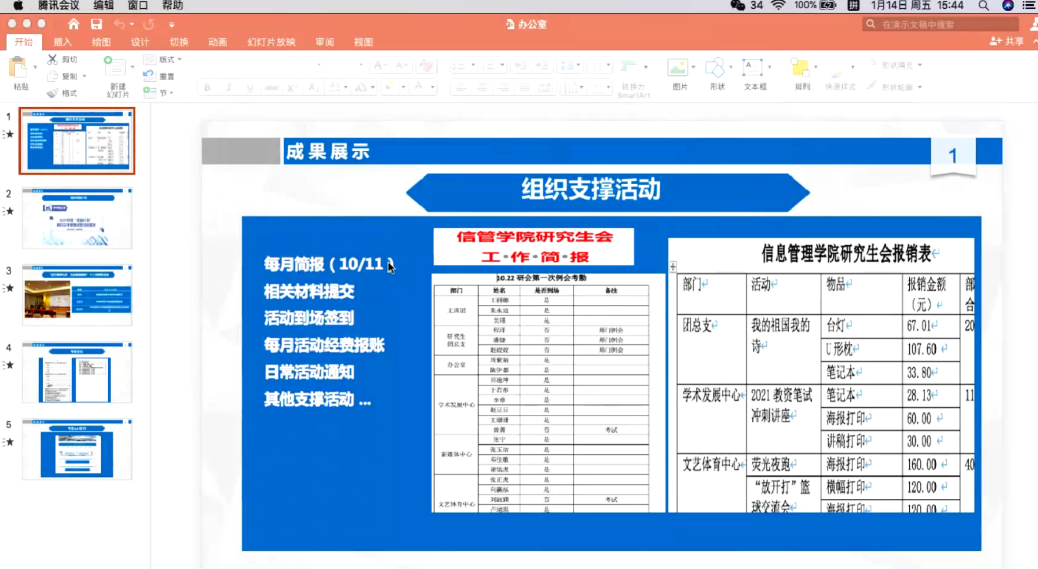(通讯员 邓佳敏)为持续高效开展研究生会工作,总结前一阶段工作成果与经验教训,进一步明确今后工作目标,更好地完成工作任务,增强全体干部对研究生会的归属感,信息管理学院研究生会于2022年1月14日下午3:00在腾讯会议进行了第十八届研究生会团总支期末总结大会。本次会议由我院研究生会主席王丽娜主持,信息管理学院研究生会指导老师叶孔森老师、李静老师出席会议,全体研会干部参与会议。